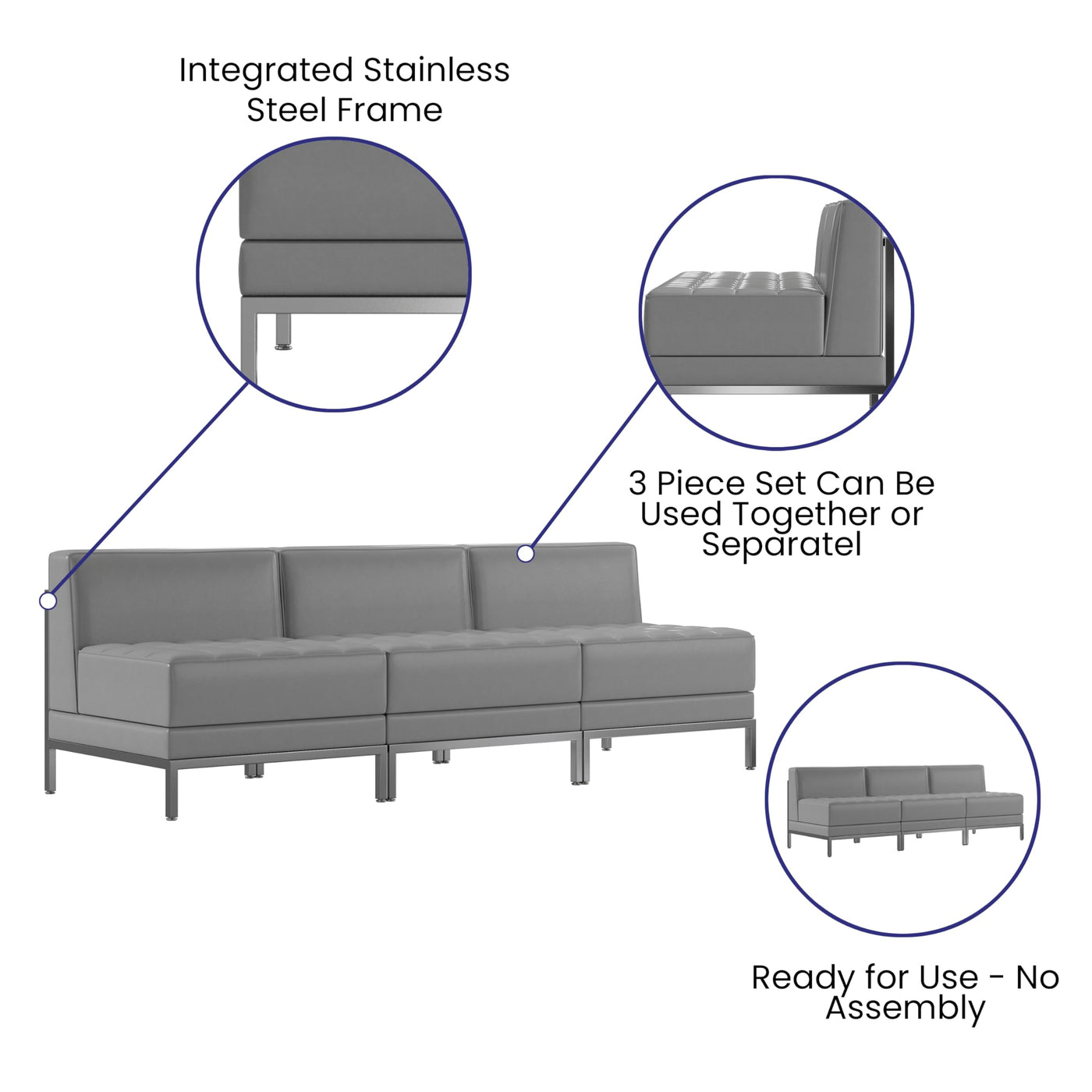 Your lobby or reception area is the forefront of your business and providing distinguished and comfortable seating is the first step towards making a great impression. Welcome your clients, customers and guests with this lovely gray LeatherSoft upholstered lounge set. LeatherSoft is leather and polyurethane for softness and durability. The striking stainless steel legs and frame lend an air of sophistication to this modular set to make it stand out. Featuring a taut back and biscuit tufted seat this reception seating group will add elegance to any decor. Thickly padded cushions with CAL 117 fire retardant foam, and a low back design will keep visitors relaxed and comfortable while they wait. Perfect for waiting room use, these chairs provide optimum support for long hours of sitting. This lounge seating set will seat up to 3 people and spills clean up easily with a solvent based cleaner, no water needed. This collection offers modular pieces that will allow you to reconfigure the space to accommodate your guests as your business grows. Purchase this complete set and add on any additional pieces now or later to make your waiting room, hotel lobby or hospitality area the best it can be.