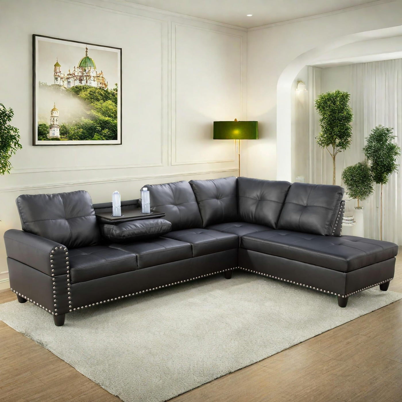 Fontoi Leather Sectional Couch Sofa, Modern Nail-Head Design L Shaped Sectional Sofa For Living Room, 4 Seat L Couch With Cup Holder For Bedroom, Black Za