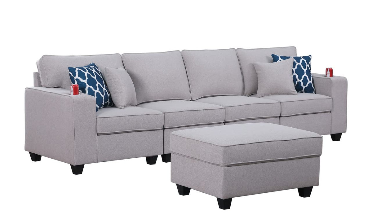 Lilola Home Cooper Light Gray Linen 4-Seater Sofa with Ottoman and Cupholder