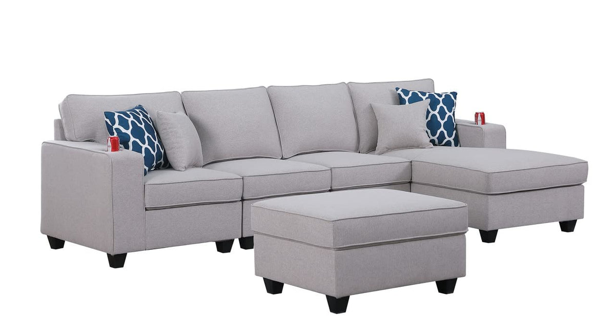 Lilola Home Cooper Light Gray Linen 5Pc Sectional Sofa Chaise with Ottoman and Cupholder