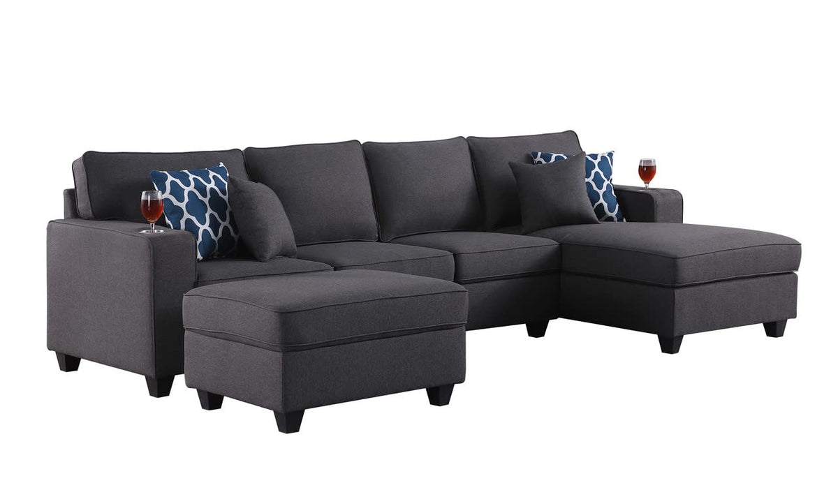 The Cooper Collection has all the important features you want ? comfort, style, quality! This beautiful sectional sofa chaise with an ottoman will fit into any living room and impress your guests! The sectional has built-in cupholders on both arm rests to hold your most refreshing drinks. The comfortable linen fabric with 4 matching throw pillows will light up your living room with the trendiest of looks. The design is perfect for any living space to welcome multiple guests where everyone will be able to enjoy entertainment together.