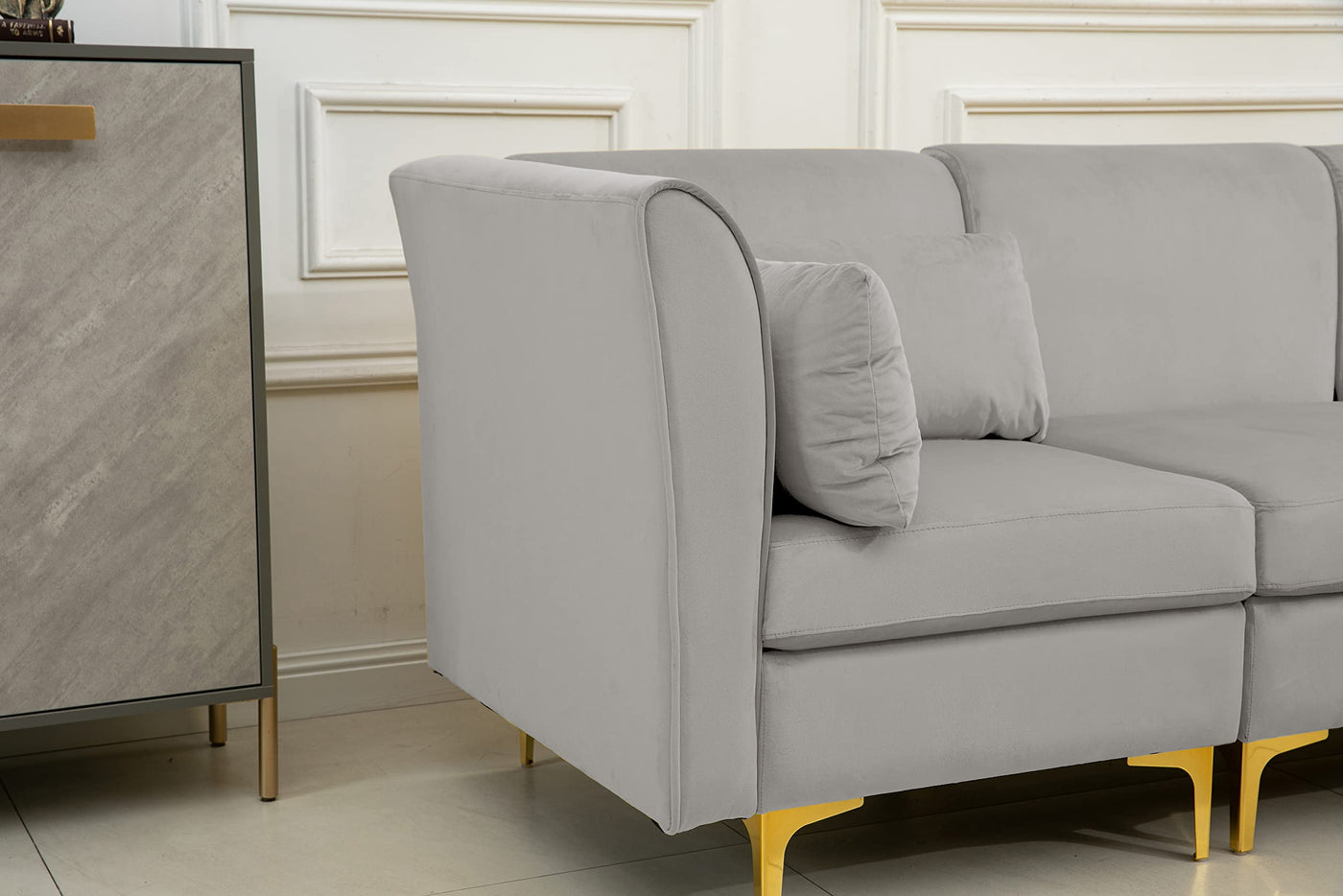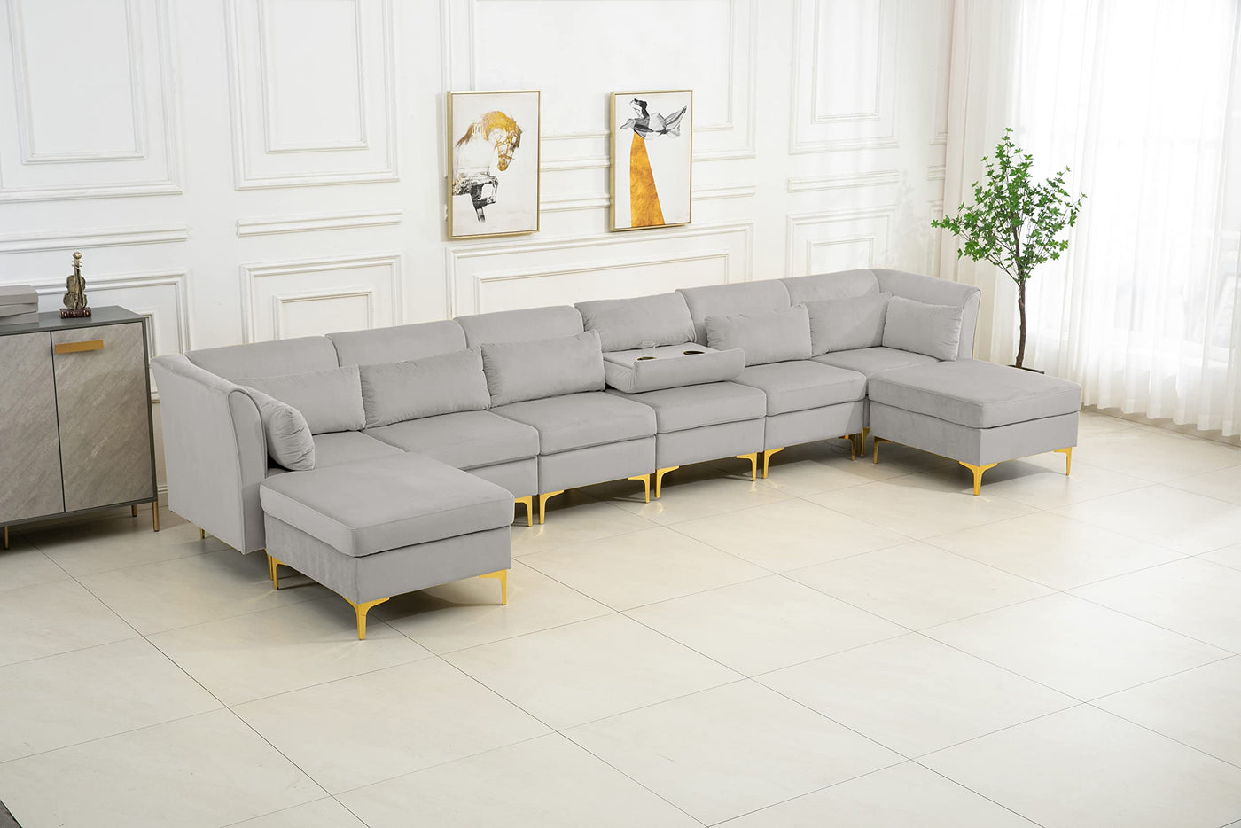 Lilola Home Jaka Light Gray Woven Fabric 6-Seater Sofa with Dropdown Table and Ottoman