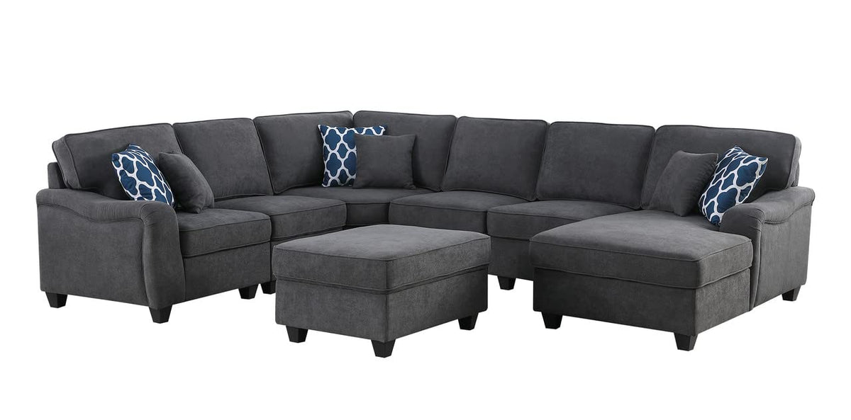 The inviting vintage style of this sectional sofa will provide a fresh, yet classic appeal to make a statement in any space. This beautiful 7-piece modular L-shape corner sectional couch with ottoman will fit into any living room and impress your guests! The comfortable dark gray woven fabric with matching accent pillows will light up your living room with the trendiest of looks.