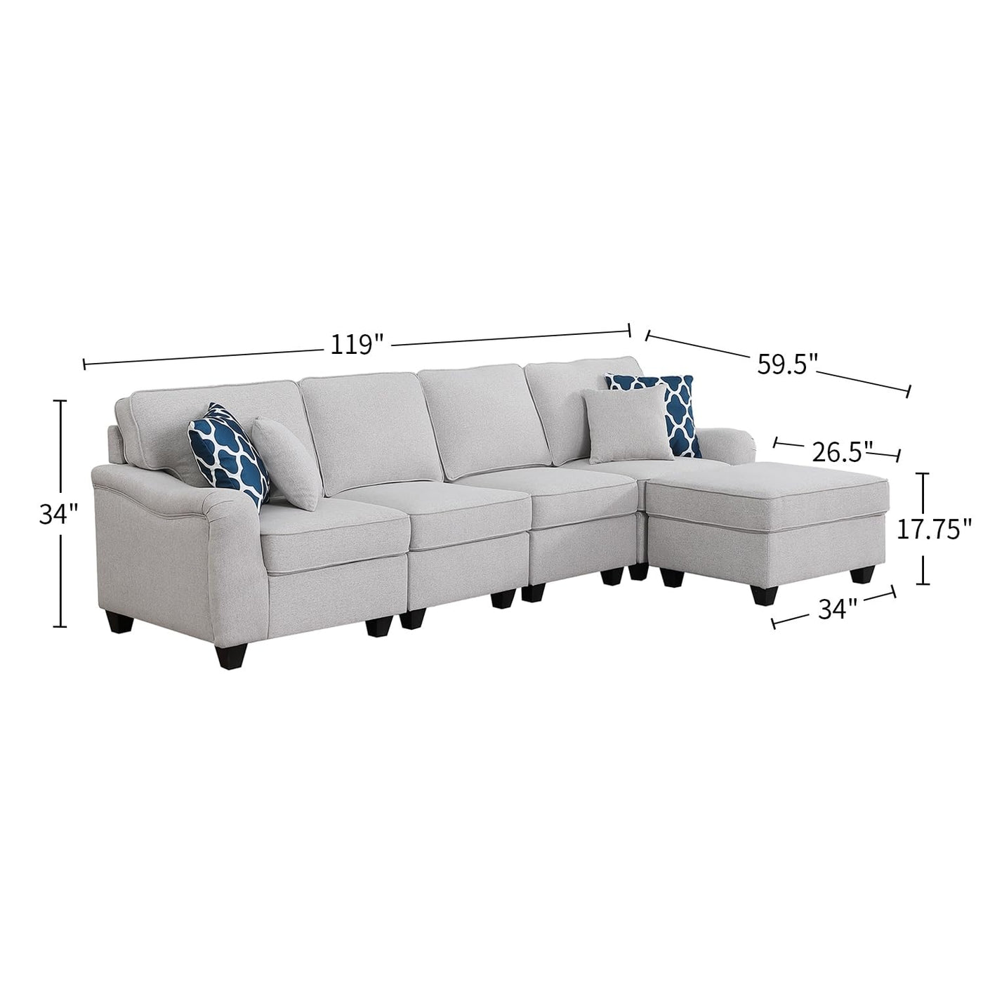 The inviting vintage style of this sofa set will provide a fresh, yet classic appeal to make a statement in any space. This beautiful 5-piece couch and ottoman will fit into any living room and impress your guests! The comfortable light gray linen fabric with matching accent pillows will light up your living room with the trendiest of looks.