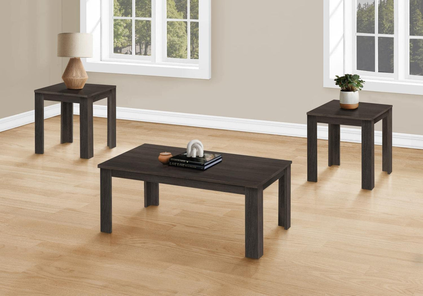 Refresh your living space with this classic contemporary style 3 piece occasional table set. Finished in an alluring wood-look finish, the coffee table with matching end tables make an exceptional fit in any space. The rectangular coffee table has a spacious table top for books, magazines, decorative items, while the complementary square end tables can easily hold a lamp, pictures, and more décor objects. Featuring strong square cut legs and sleek lines for a classic look with a casual contemporary appeal.
