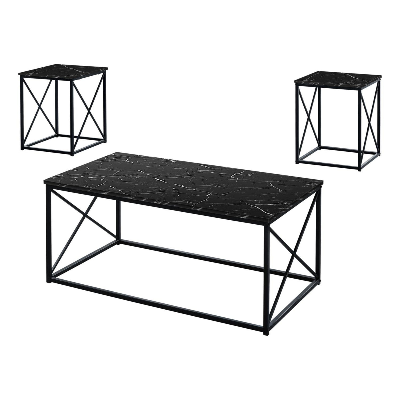 With simple and sturdy legs and a contemporary black marble-look table top, this living room table set features a rectangular coffee table and two end tables to complete the collection. A sturdy X design silver metal frame complements the table top to fill your living room with a cool, modern look. The square and rectangular shapes will be easy to place anywhere in your small home, condo or apartment.