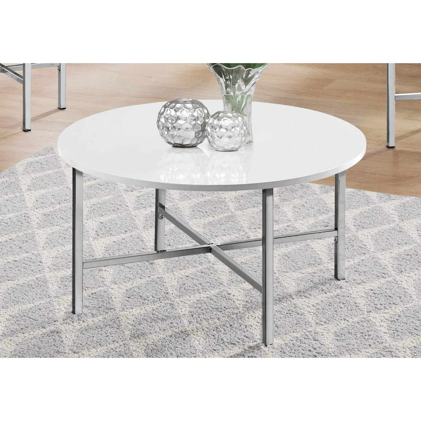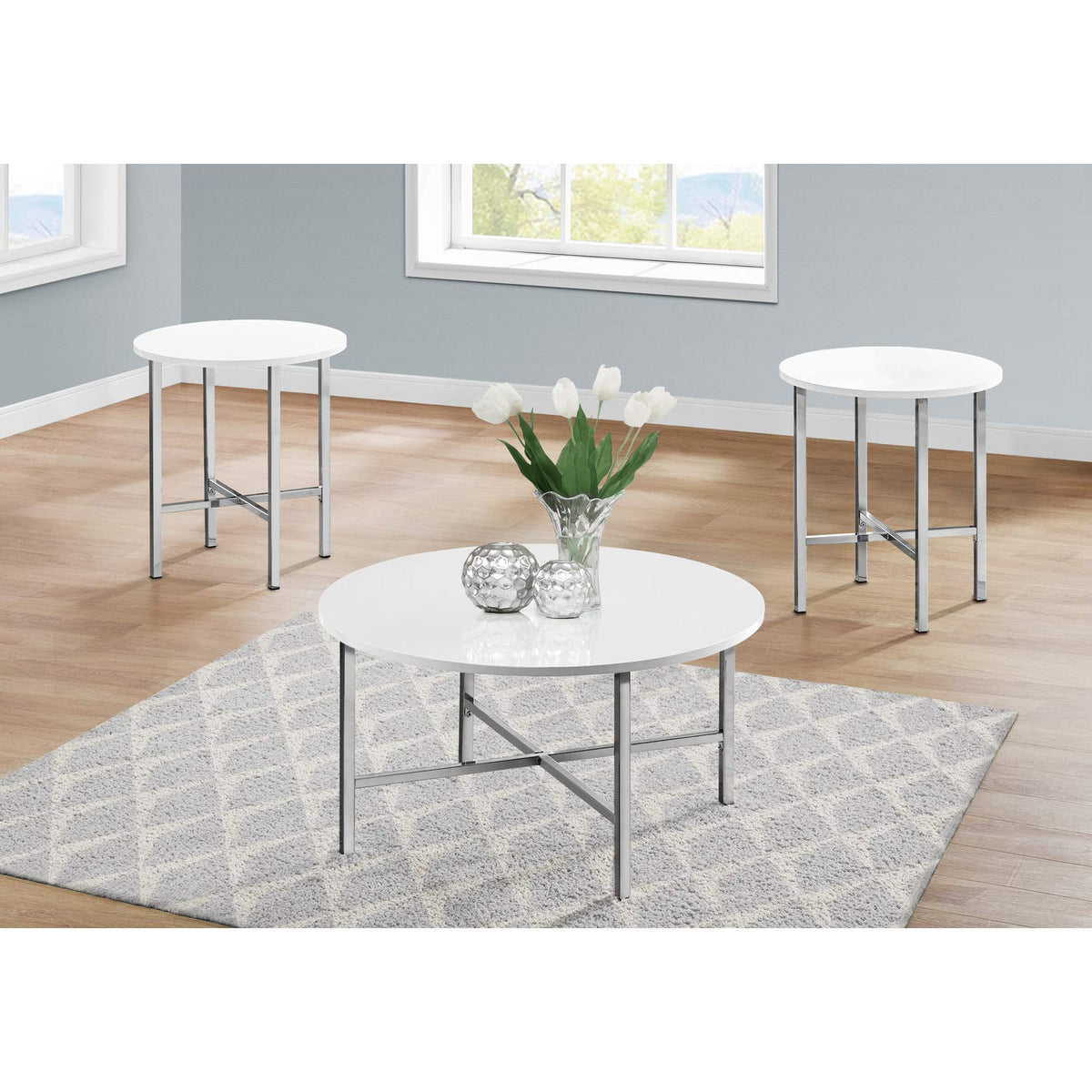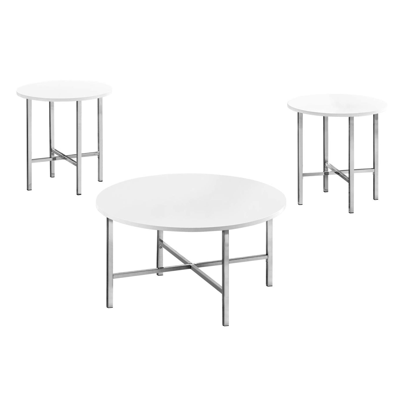 Refresh your living room with this stylish and contemporary 3 piece round table set that will add polish to your space. The clean lines of this set include a coffee table with a spacious glossy white surface to showcase an artful arrangement, place some books or magazines, or to set down a tray of snacks when entertaining. The matching end tables can hold a lamp with space to put down your drink. The tables are supported with a sleek cross metal base in a lustrous chrome finish for a nice, simple overall design. This table set fits perfectly in a small living room, family room, or office area without crowding a space or sacrificing style. Assembly is required.