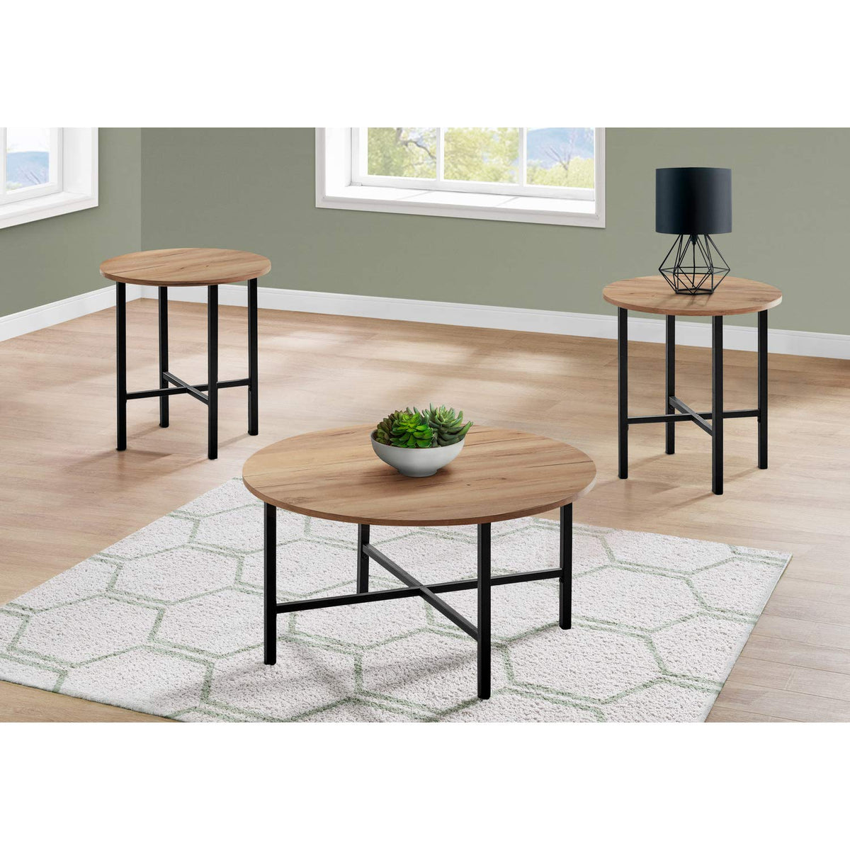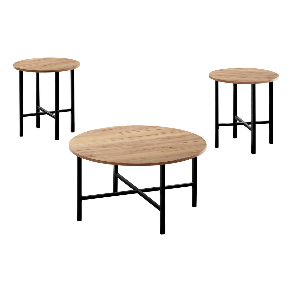 DescriptionRefresh your living room with this stylish and contemporary 3 piece round table set that will add polish to your space. The clean lines of this set include a coffee table with a spacious golden pine wood look surface to showcase an artful arrangement, place some books or magazines, or to set down a tray of snacks when entertaining. The matching end tables can hold a lamp with space to put down your drink. The tables are supported with a sturdy cross metal base in a solid black finish for a nice, simple overall design. This table set fits perfectly in a small living room, family room, or office area without crowding a space or sacrificing style. Assembly is required.