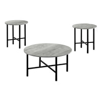 Refresh your living room with this stylish and contemporary 3 piece round table set that will add polish to your space. The clean lines of this set include a coffee table with a spacious grey reclaimed wood look surface to showcase an artful arrangement, place some books or magazines, or to set down a tray of snacks when entertaining. The matching end tables can hold a lamp with space to put down your drink. The tables are supported with a sturdy cross metal base in a solid black finish for a nice, simple overall design. This table set fits perfectly in a small living room, family room, or office area without crowding a space or sacrificing style. Assembly is required.