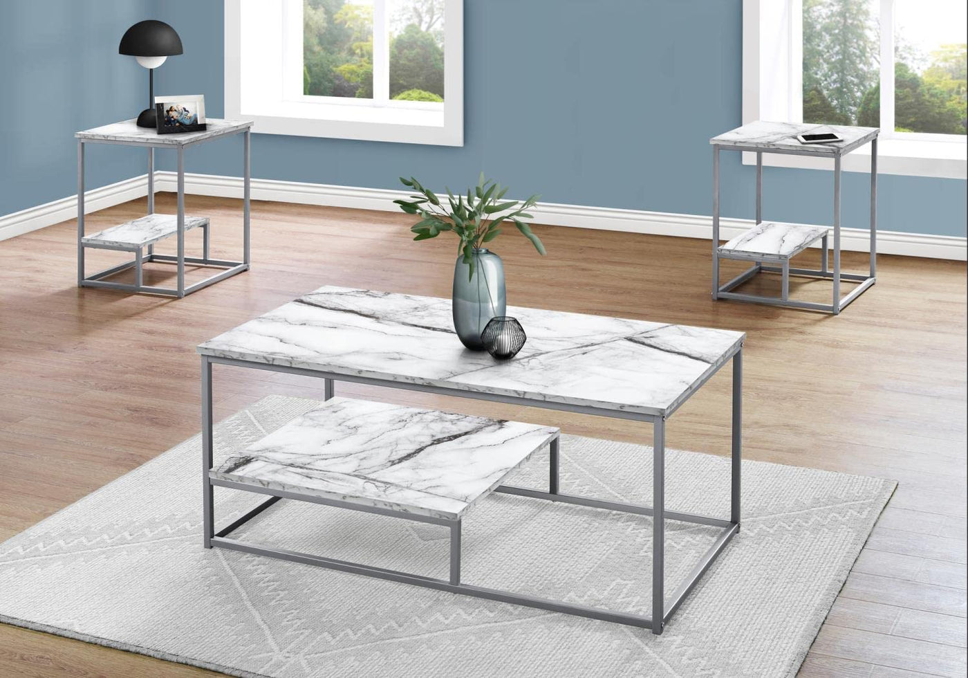 From homes, condos and apartments, this contemporary space-saving table set, includes a coffee table and 2 End Tables fits perfectly in your living room, basement, family room or bedroom. Supported by silver metal sleek base, this table combines both style and practicality perfectly. This 3 piece sete will accommodate anything from plants, electronics, photo frames to books and other decor items and have a convenient storage shelf. With a modern white marble-look finish, it will warm up your living space effortlessly.
