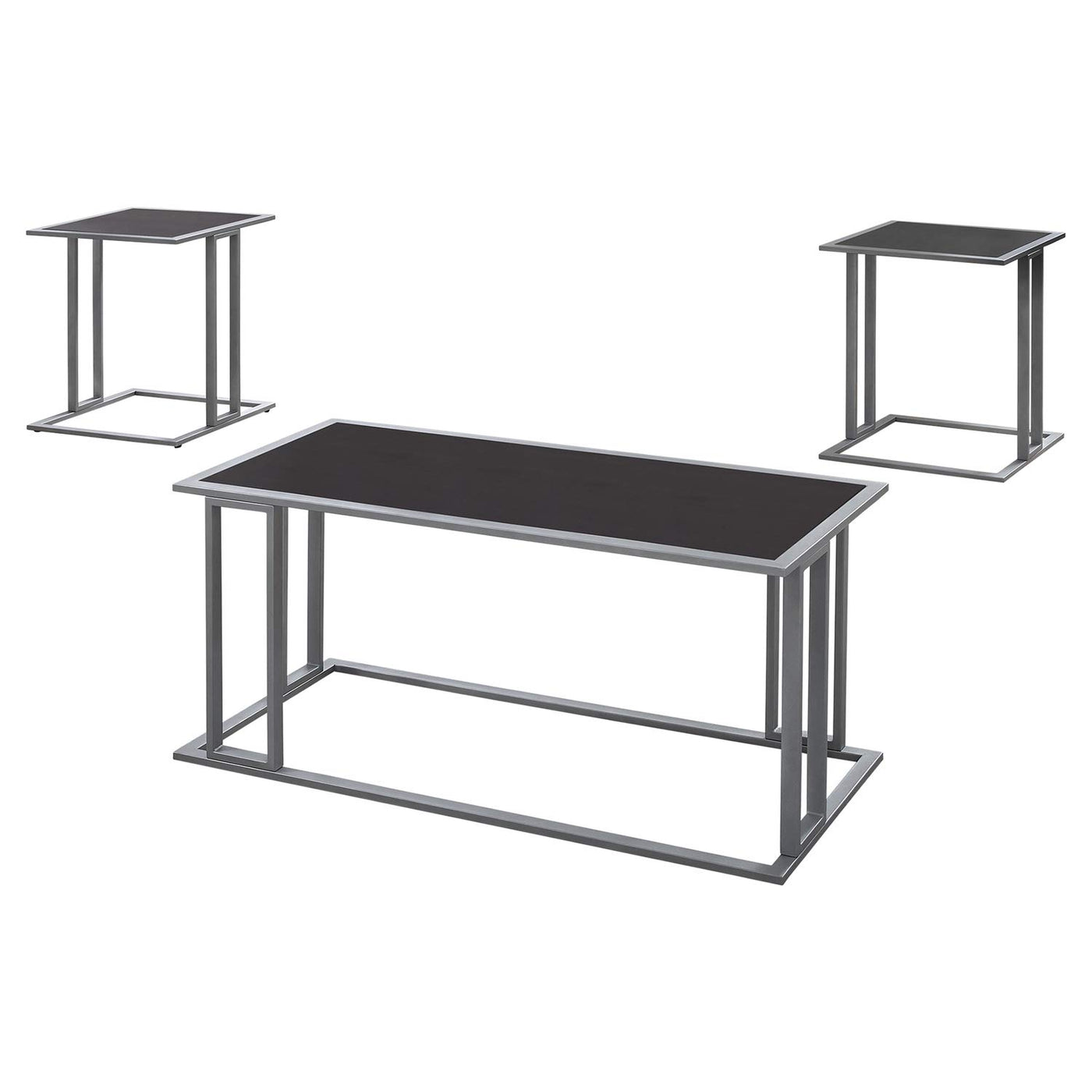 Bring a fresh urban style to your living space with this unique, modern 3 piece coffee table set. The table tops are finished in a warm cappuccino laminate and framed in a solid silver metal base with a contemporary design. The rectangular coffee table with a spacious surface is just the right size for compact spaces and the matching square topped side tables can easily hold a pair of lamps or decorative objects. The simple minimalist style of this table set will anchor your living room or family room to perfection!