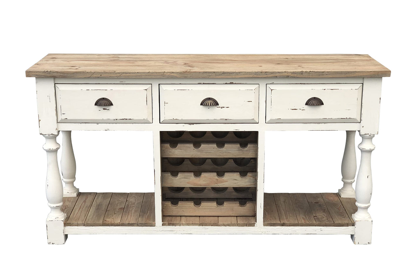 The Farmhouse Console Wine Rack White Chalk Finish and Natural Top is hand made using Authentic Reclaimed New Zealand Pine. The finish is an appropriate finish for the period and combines the natural aged Pine with a contrast of old fashioned Casein Chalk White Finishing. The console features 3 drawers, open plank base shelving, and the center has been fitted with bottle storage combining to create a very nice authentic look. The console sideboard was crafted 63 wide x 17.75 deep x 33.5 tall inches. The item is handmade and also Bench Made, finely crafted furniture that will last forever, made one piece at a time. The wood used is Reclaimed wood imported from New Zealand; it is old repurposed wood rescued from old barns, houses, barns, boxcars, and wine barrels. Wood that is highly prized for the authentic seasoned effects and age old character. It is environmentally good to repurpose the wood and an essential part of the authentic look and quality of our new American Farmhouse and or our Coastal Series from the Heritage Collection, a division of AFD Home. The Series is an expanding collection with lots of affordable, purely fashioned furnishings offerings befitting a more relaxed American lifestyle. All of the Series pairs perfectly with each other and can be mixed matched and combined to increase the desired interior design. Hand Made and imported from Indonesia. No Assembly Required Perfect for a rustic, coastal, or farmhouse style interior. Handcrafted in Imported Authentic New Zealand Pine Reclaimed wood rescued and repurposed wood from old barns, houses, barn, boxcars, and wine barrels. Wood that is highly prized for the authentic seasoned effects and age old character. It is a part of a popular new American Farmhouse and or our Coastal Series from the Heritage Collection. The Series is an expanding series that is affordable yet appropriately fashioned for a more relaxed American lifestyle.