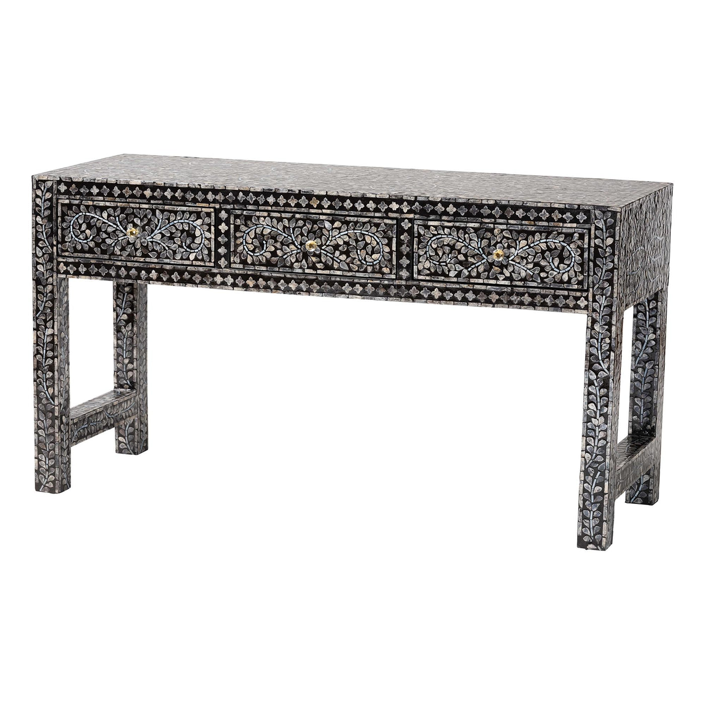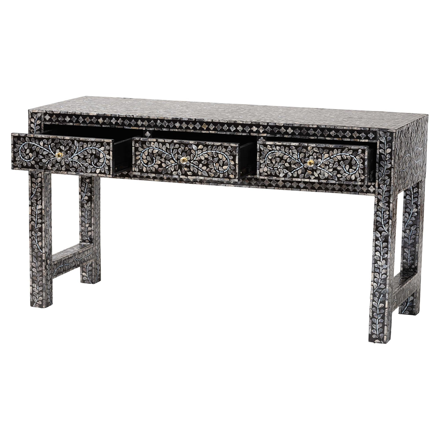 Enliven the ambiance of your space with the vivid flair of the Elara console table. Made in Vietnam, this coastal piece consists of a sturdy wood frame intricately encased in natural Capiz shell showcasing a beautiful floral design. Three drawers offer superb storage for household essentials while reserving the tabletop as an enchanting display area. The Elara will arrive fully assembled and is fitted with faux crystal knobs for an extra dose of glamorous fashion. Evoking an air of elegant poise, the Elara console table ornaments any setting.Features:Coastal Console TableConstructed from Capiz Shell and Engineered WoodIncludes three (3) interlocking drawers with metal glidesFaux crystal drawer knobsRectangular tabletop enables versatile storage and use in a variety of layoutsFully AssembledSpecifications:Product Dimensions: Overall: 55.10" W x 19.70" D x 29.90" H; Drawer(s): 13.30" W x 14.60" D x 4.00" H; Clearance(floor to bottom of drawers): 21.00"H;Clearance(floor to sidebar): 4.30"H;