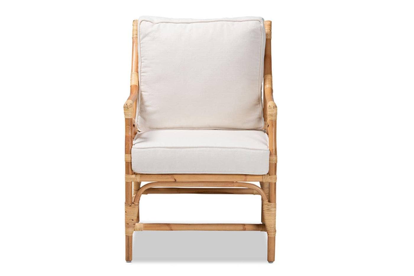 Baxton Studio Brandon Modern Bohemian White Fabric Upholstered and Natural Brown Rattan Armchair