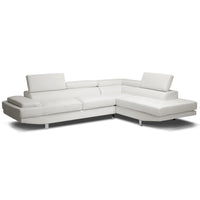 Seductively sleek and unapologetically urban, the Selma Designer Sectional is a star in the sofa world. Baby sofas everywhere can only hope to grow up to have features as substantial as Selma's: a solid hardwood frame, firm foam cushioning, s springs and pocket springs are the things dreams are made of. Adjustable headrests, metal bracket connectors and chrome-plated legs with non-marking feet take this modern sofa and chaise set to the next level. Made in Malaysia, the Selma Sectional is finished with white bonded leather (also offered separately in black), requires assembly and should be wiped clean with a damp cloth. Seat height: 19 Inch Dimensions: 28.5 Inch to 36.5 Inch high x 119.75 Inch wide x 89.5 Inch deep.