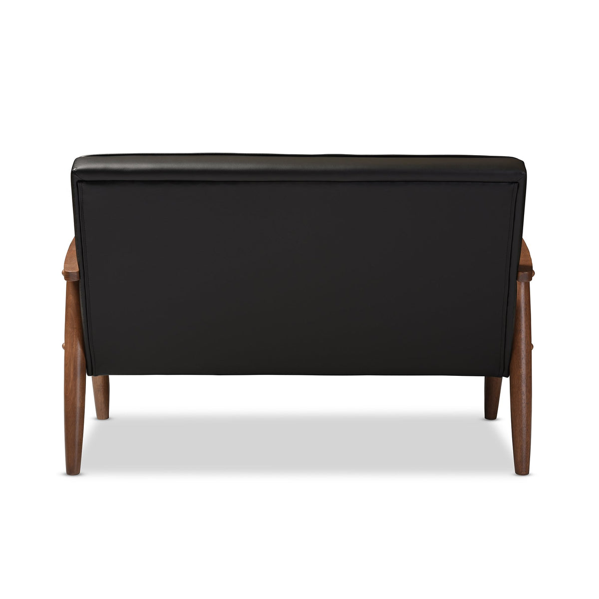A simple, post-modern design that works well with a variety of styles, the Sorrento 2-seater loveseat is upholstered in black faux leather with solid rubberwood legs and frame. The sculptural arms and wide, welcoming seat are a throwback to classic 1950s and 60s Danish design. A fully upholstered seat with exposed dark walnut wood looks great from all angles, whether in a lounge arrangement, public waiting area or private office. The splayed legs and button-tufting design add a retro modern touch to this piece of clean lines furniture. The Sorrento features light weight and easy handling. It will be suitable for those urban dwellers with limited space. It could be a cool-looking reading nook within 30 minutes of assembly out of a box. Made in Malaysia, the Sorrento will be a standout piece in any modern interior.