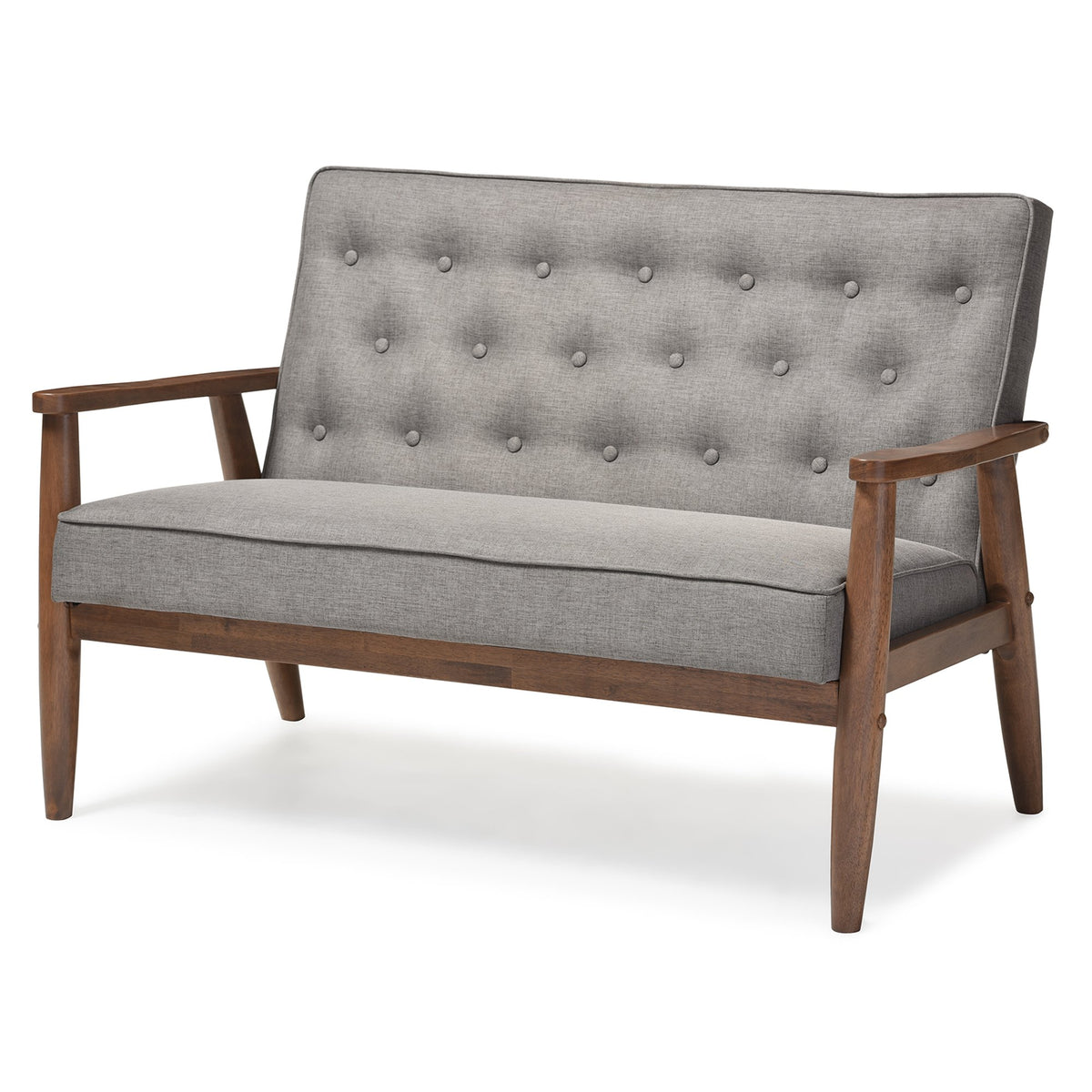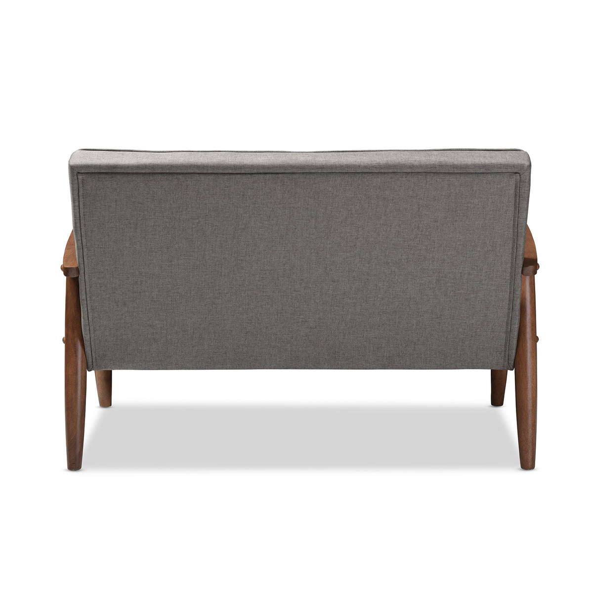 A simple, post-modern design that works well with a variety of styles, the Sorrento 2-seater loveseat is upholstered in grey polyester fabric with solid rubberwood legs and frame. The sculptural arms and wide, welcoming seat are a throwback to classic 1950s and 60s Danish design. A fully upholstered seat with exposed dark walnut wood looks great from all angles, whether in a lounge arrangement, public waiting area or private office. The splayed legs and button-tufting design add a retro modern touch to this piece of clean lines furniture. The Sorrento features light weight and easy handling. It will be suitable for those urban dwellers with limited space. It could be a cool-looking reading nook within 30 minutes of assembly out of a box. Made in Malaysia, the Sorrento will be a standout piece in any modern interior.