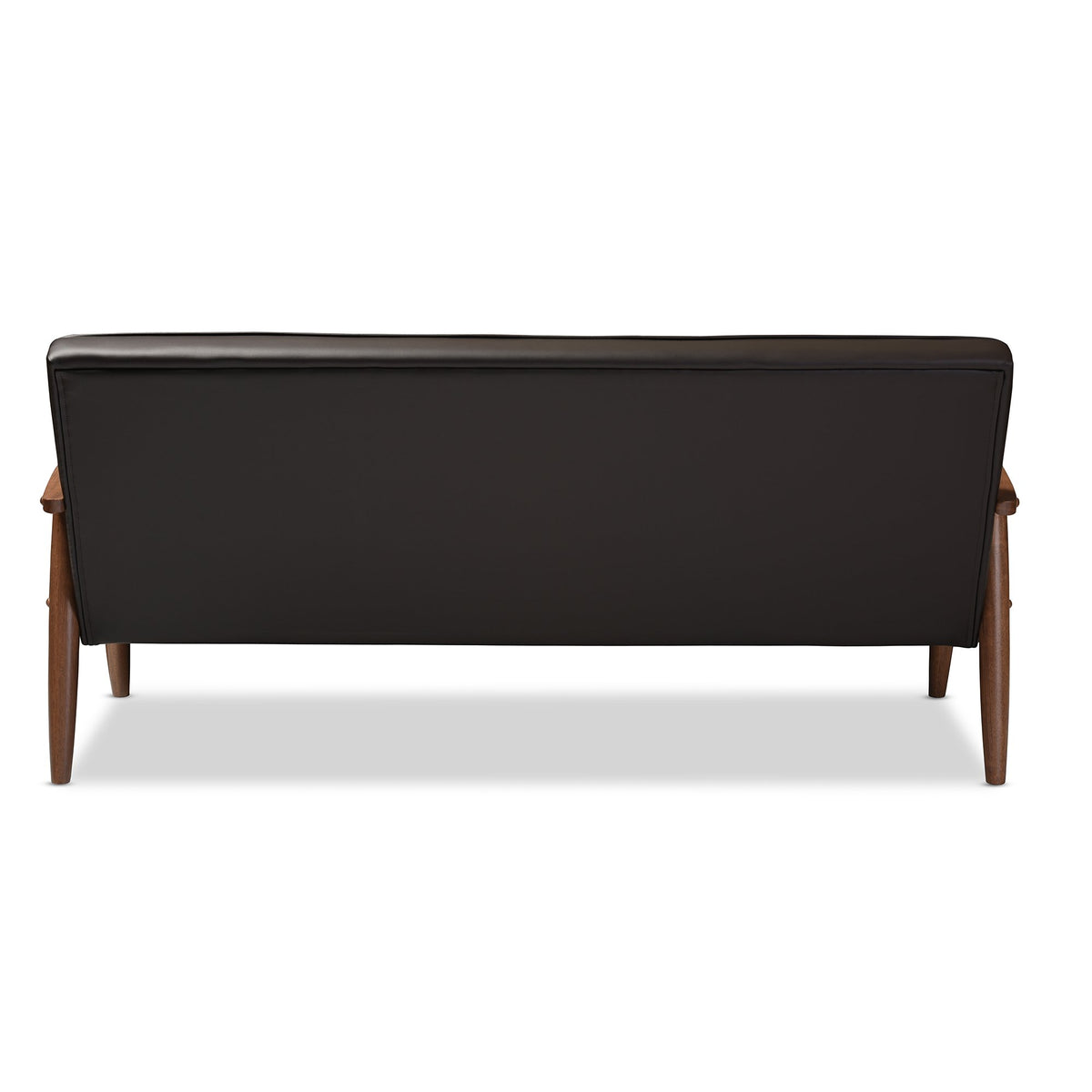 A simple, post-modern design that works well with a variety of styles, the Sorrento 3-seater sofa is upholstered in brown faux leather with solid rubberwood legs and frame. The sculptural arms and wide, welcoming seat are a throwback to classic 1950s and 60s Danish design. A fully upholstered seat with exposed dark walnut wood looks great from all angles, whether in a lounge arrangement, public waiting area or private office. The splayed legs and button-tufting design add a retro modern touch to this piece of clean lines furniture. The Sorrento features light weight and easy handling. It will be suitable for those urban dwellers with limited space. It could be a cool-looking reading nook within 30 minutes of assembly out of a box. Made in Malaysia, the Sorrento will be a standout piece in any modern interior.