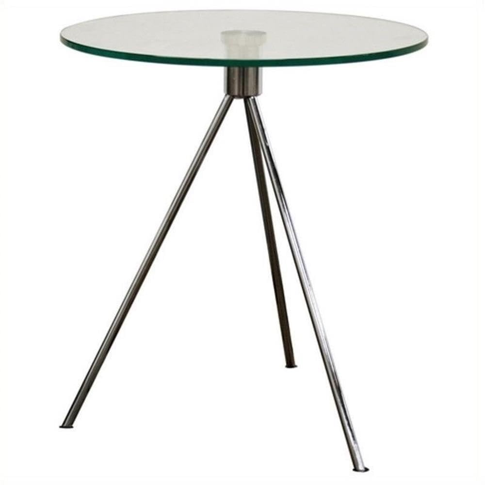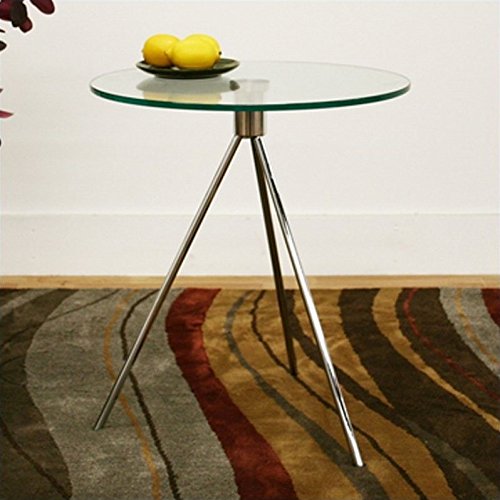 This sleek modern end table makes it a point to provide a simple yet elegant place to rest beverages or add decorative accents to complete any living room set. The round tabletop is made of tempered glass and sits on a very sturdy tripod base made of steel with a brushed finish. Small black plastic non-marking feet are included, and some simple assembly is required.