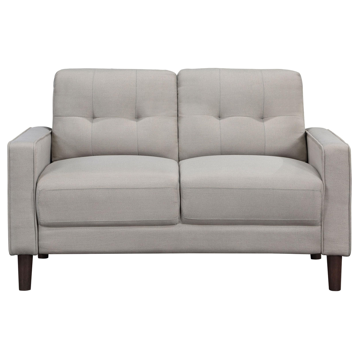 Ideal for studio apartments or small rooms, this loveseat boasts a perfect small-scale design. Its classic track arm and self-welt detailing highlight the superior tailoring. The grid-tufted boxed back cushions and pocket coil spring cushion construction ensure comfort and support. With brown tall round tapered legs, it offers a sturdy foundation. Assembly is a breeze, and its solution-dyed performance fabric is easy to clean.FeaturesPerfect small-scale loveseat design for studio apartments or small rooms Classic track arm and self-welt detailing for superior tailoring Grid-tufted boxed back cushions and pocket coil spring cushion construction for comfort and support Brown tall round tapered legs for a sturdy foundation Solution-dyed performance fabric for easy cleaning and assemblyDimensions:LoveseatAssembled Product: 54.25 inches wide x 32.75 inches deep x 34.25 inches high Seat Width: 45 inches Seat Depth: 20.75 inches Seat Height: 20 inches Arm Height: 24 inches Weight Capacity: 300 poundsAt Coaster, we are your premier source for exquisite furniture, offering diverse styles to enhance every aspect of your life. Our passion for excellence drives us to innovate, crafting budget-friendly furniture that complements your lifestyle. Explore our brands for endless design inspiration and make your living experience exceptional with thoughtfully designed, affordable pieces that inspire a life well-lived.