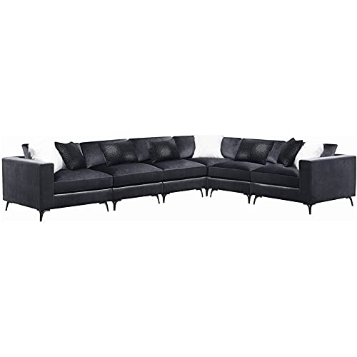 Mood-enhancing contemporary design offers an irresistible element to spice up a modern living room or entertainment space. Wrapped in soft, sleek charcoal velvet upholstery, this right- or left-facing armchair becomes part of a larger sectional or stands alone to provide ultimate comfort and a bold aesthetic for a stylish room. A brushed black nickel finish metal frame offers beautiful coordination and charming curved legs. Enjoy supreme luxury while sitting on pocket coil springs and a feather blend wrap. Includes two accent pillows to complete an attention-getting look.
