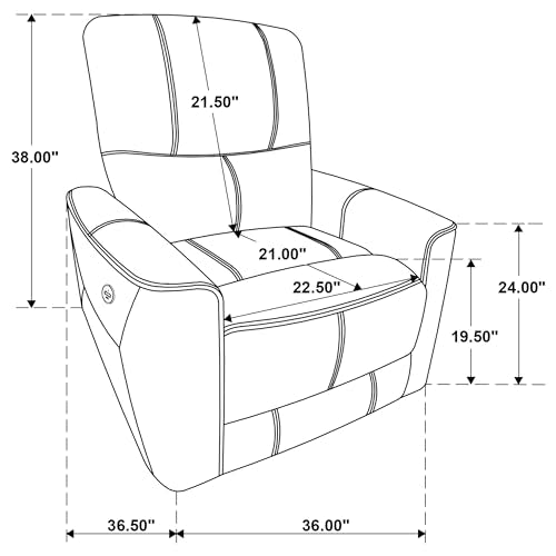 Recliner with versatile saddle brown leatherette upholstery adds a fresh tone and easy-care maintenance | Plump fill and tailored channeling create targeted comfort for just the right body positioning | Attached seat and back cushions and straight armrests enhance both style and comfort | Smooth power reclining adds a luxury comfort feature for customized seating and cozy lounging | A built-in switch panel with a handy USB port for charging devices is accessible and convenient