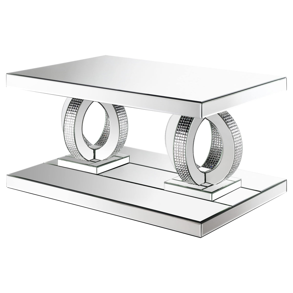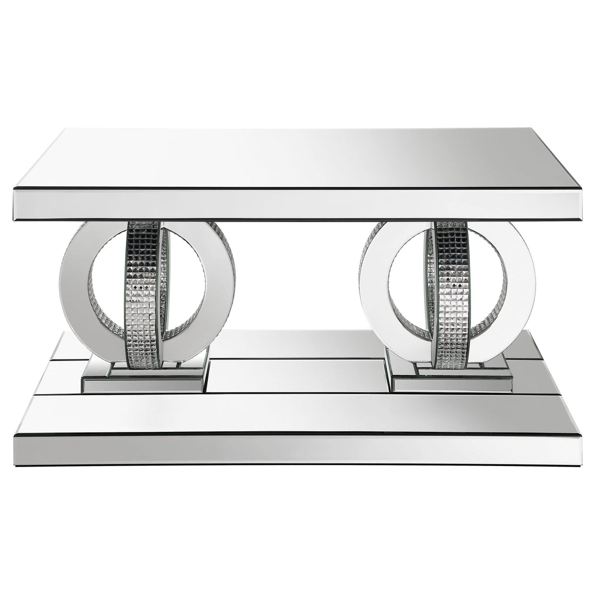 Drop this breathtaking, glam coffee table at the center of a seating area. Created with a rectangular shape, covered with polished, gleaming mirror surfaces, this coffee table creates a refined look within a living room and entertainment area. A pedestal-like base with sphere-inspired, interconnected dual rings pushes total Hollywood regency vibes. Each pedestal ring base is wrapped in a scintillating, faceted mirror-like tiles around the outer edges for a striking visual effect. softly beveled edges on each mirror trim and tile further add to the classy nature.