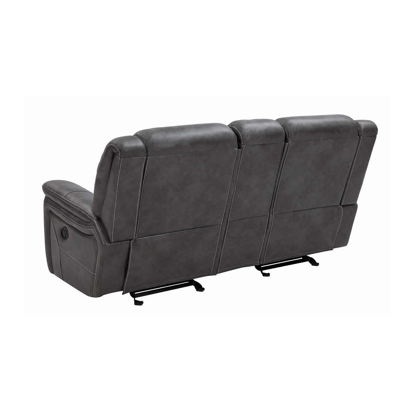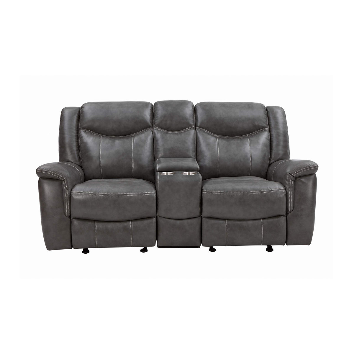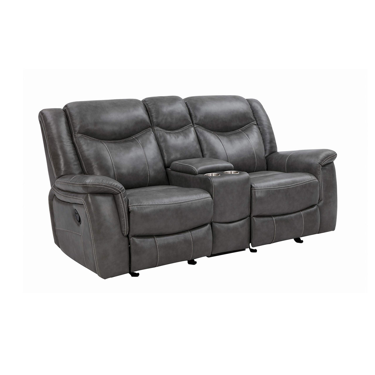 Grey is no longer drab and dreary and this decadent motion loveseat is proof. The angled seat backs feature extra padded headrests for optimal comfort. Padded armrests and recliner leg rest offer extra indulgence. Center console includes amenities like two cup holders and storage space. This loveseat comes wrapped in cool grey leather-like upholstery for a modern appeal.
