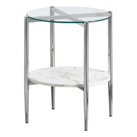 Sleek and sophisticated, this round end table offers incredible construction for a chic addition in your living space. The round tabletop is enhanced with glass to perfectly place a small table lamp or house plant. The center shelf is elegantly crafted from faux marble in hues of white and grey. Place your favorite decor piece on the top or bottom shelf and watch this glass end table enhance your space. Consider pairing this piece with a matching coffee table to complete the look.FeaturesStylish mix of finishes and texture Tempered glass top supported with an X base with round tapered legs Features a beautiful faux Carrara marble shelf Constructed with metal, tempered glass, particle board, and engineered laminateDimensions:Side TableAssembled Product: 21 inches wide x 21 inches deep x 24 inches high Weight Capacity: 100 poundsAt Coaster, we are your premier source for exquisite furniture, offering diverse styles to enhance every aspect of your life. Our passion for excellence drives us to innovate, crafting budget-friendly furniture that complements your lifestyle. Explore our brands for endless design inspiration and make your living experience exceptional with thoughtfully designed, affordable pieces that inspire a life well-lived.