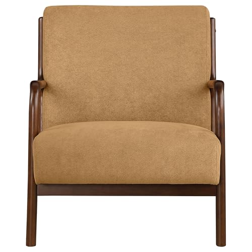 Includes: One (1) chair | Mid-century charm infuses a modern accent armchair to provide character in any setting | Structured wood frame features a deep cappuccino wood finish that's smooth and clean | Gentle curves define a laid backs silhouette, offering soft, inviting style to beautiful woodwork | Smooth, soft upholstery offers a fresh touch in a living area or bedroom seating area | Legs feature plastic glides to protect flooring underneath