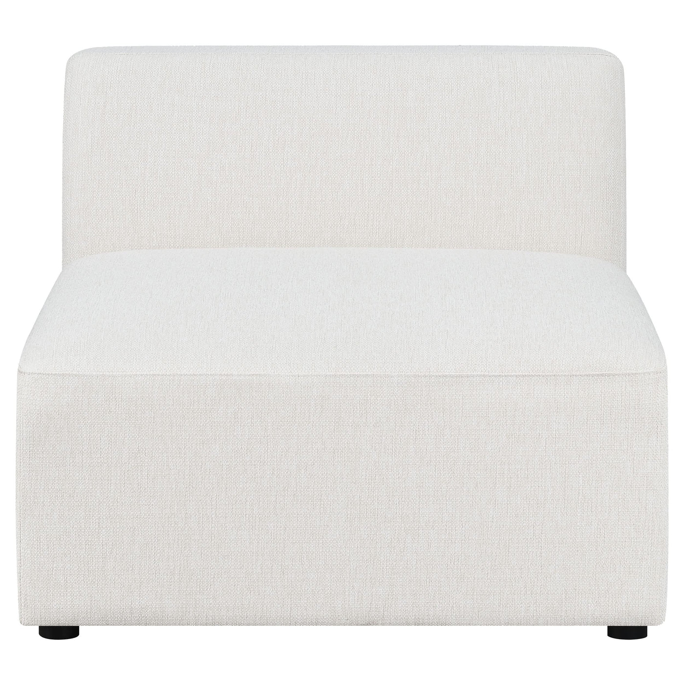 Create your ideal sectional configuration with this modern armless chair, upholstered in an easy-to-maintain pearl performance fabric across a foam padded pocket coil seat and low-profile attached back. A thick bottom seat rests on hidden black round legs, lending a hint of contrast and a clean, seamless silhouette.