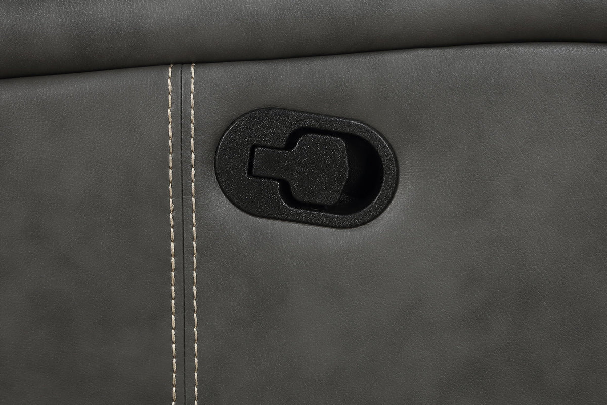 Merging the classic style of both contemporary and transitional design schemes, the motion sofa creates a dreamy venue for relaxing and entertaining. Choose a pleasing motion sofa covered in smooth gray leatherette upholstery with vertical topstitching adding decorative elements and a dimensional impact. This sofa features foam padding on its frame and in-pocket coil spring seat cushions, as attached back cushions are capped with ultra-plump headrests. Recline into varying positions using a manual control function, and enjoy space efficiency with its wall-hugger design. A timeless style and luxurious comfort converge to offer a multi-functional and beautiful piece for entertaining or solo relaxation.