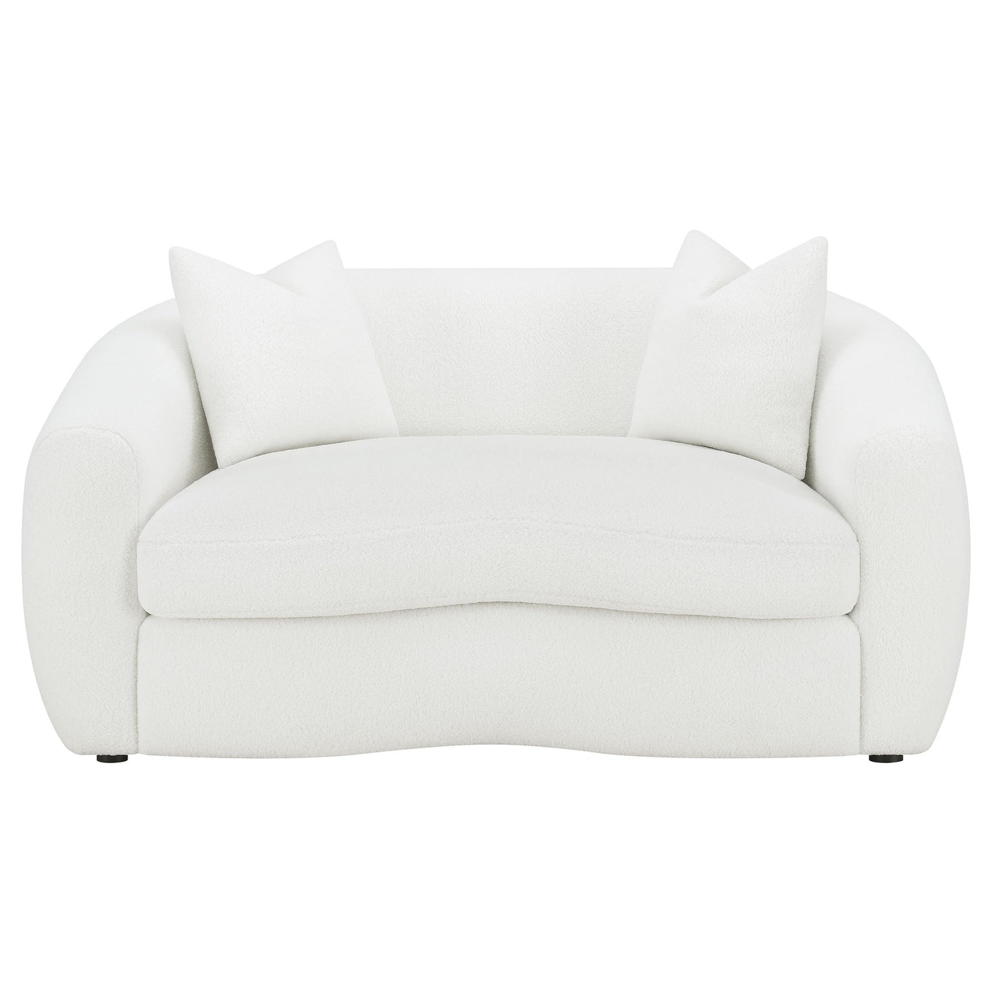 Transform your sophisticated modern living room with this vintage-like contemporary natural loveseat, featuring boucle upholstery that presents an inviting cloud-inspired resting place. Gracefully curved armrests, a single bench cushion, and a tailored backrest complete this retro-inspired look, accented by black legs.FeaturesNeutral boucle upholstery: a trendy texture must have Soft curves, round edges highlight the beautiful tailoring Removable seats with tight back will ensure its well-kept appearance Accent pillows with premium faux down pillow fill, add the perfect finishing touchDimensions:LoveseatAssembled Product: 68 inches wide x 42 inches deep x 32.5 inches high Seat Width: 48 inches Seat Depth: 26.5 inches Seat Height: 20 inches Arm Height: 25 inches Weight Capacity: 600 poundsAt Coaster, we are your premier source for exquisite furniture, offering diverse styles to enhance every aspect of your life. Our passion for excellence drives us to innovate, crafting budget-friendly furniture that complements your lifestyle. Explore our brands for endless design inspiration and make your living experience exceptional with thoughtfully designed, affordable pieces that inspire a life well-lived.