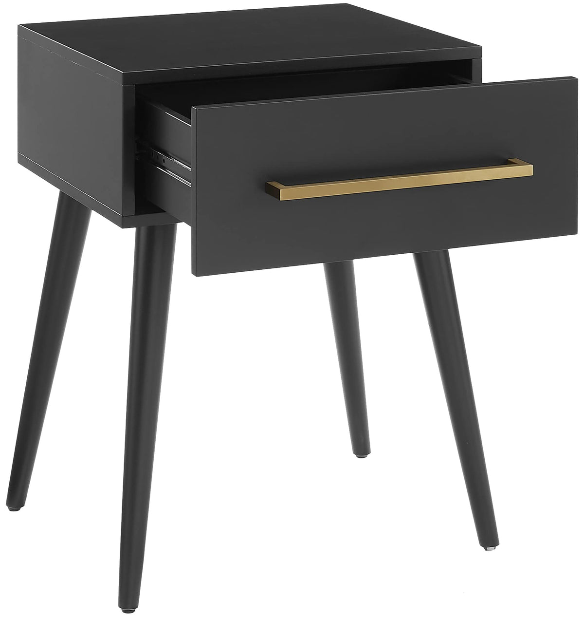 Add swagger to your living room with the stylish Everett End Table. Featuring a storage drawer and a spacious top, this end table is ideal for storing remotes and drink coasters while keeping your beverage close at hand. Accentuated by mid-century modern elements like tapered legs and substantial bar hardware, the Everett End Table will give your seating arrangement an instant upgrade.