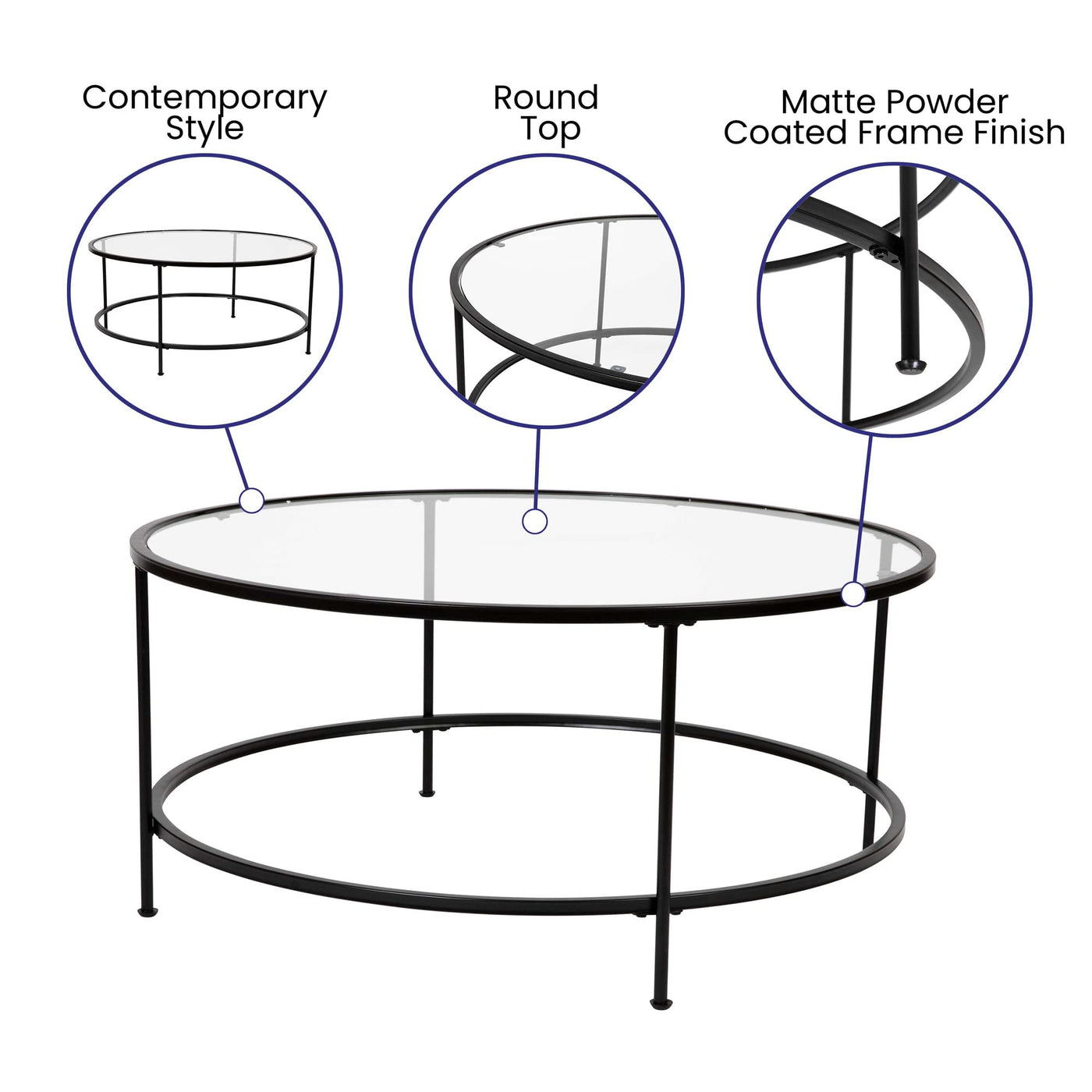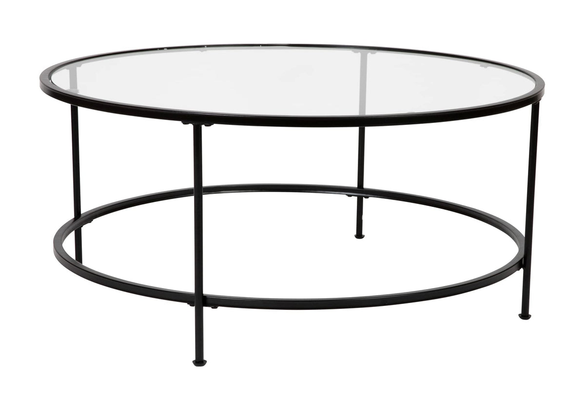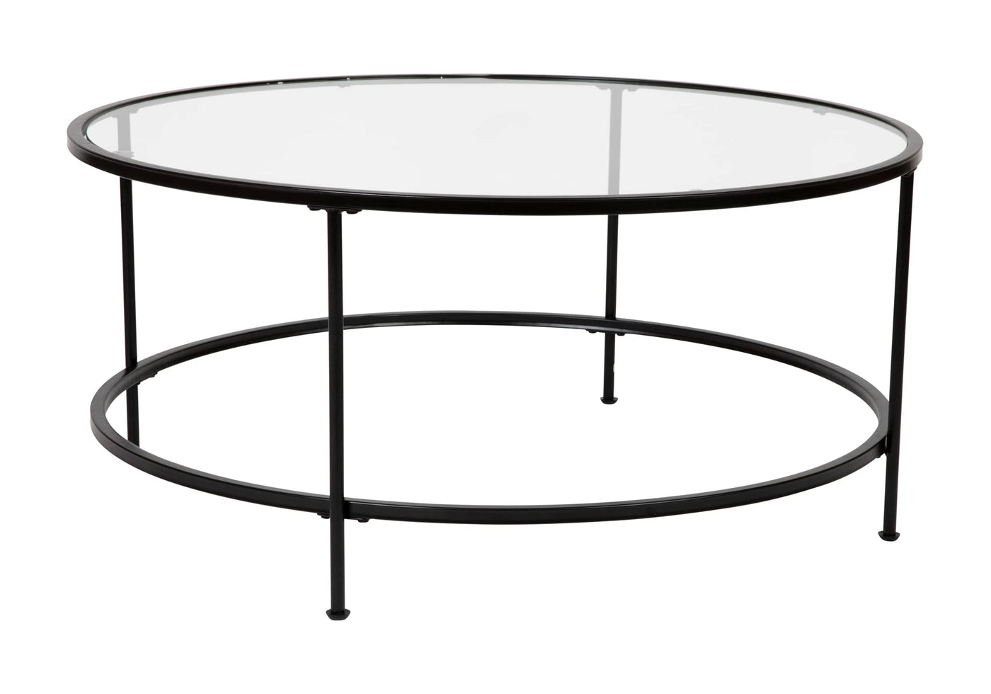 Lend any space in your home a sophisticated, polished look with this round clear glass coffee table with matte black steel legs. This living room coffee table successfully marries the beauty of glass with the strength of steel that makes a definite statement. The round top and frame contrast with the vertical legs to provide a contemporary look that's sure to tie any trendy room's presentation together. Whether you have a spacious modern home or a one bedroom apartment this round coffee table will fit right in. The round design is perfect for an L-shaped sectional in the living room, two wingback chairs in the den or with the sofa in the family room. Not only does its ample surface area serve as a convenient space for holding belongings, it's also great for displaying magazines, newspapers, and keepsakes. Glass offers a distinct, upscale look while providing superior strength that won't break even after heavy-duty use. Move this on-trend coffee table anywhere you wish without having to worry about scratches on your floors. Fixed floor glides prevent damage to your flooring and enable easy movement. Quickly remove dust or spills with a water based cleaner to keep this striking piece looking brand new. Add a pair of our glass end tables with matte black frame to pull your design together.