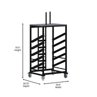 Work smarter, not harder and make the job easier when it is time for your next event. This convenient cocktail table dolly allows you to load all of your pedestal table pieces on one cart. The dolly features sloped shelves that will prevent them from sliding out of the dolly. The upholstered fabric platform top holds your bases and prevents the finish from being scratched. You can easily roll this cart on a truck to transport to different events.