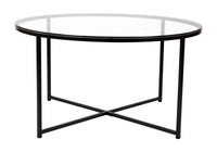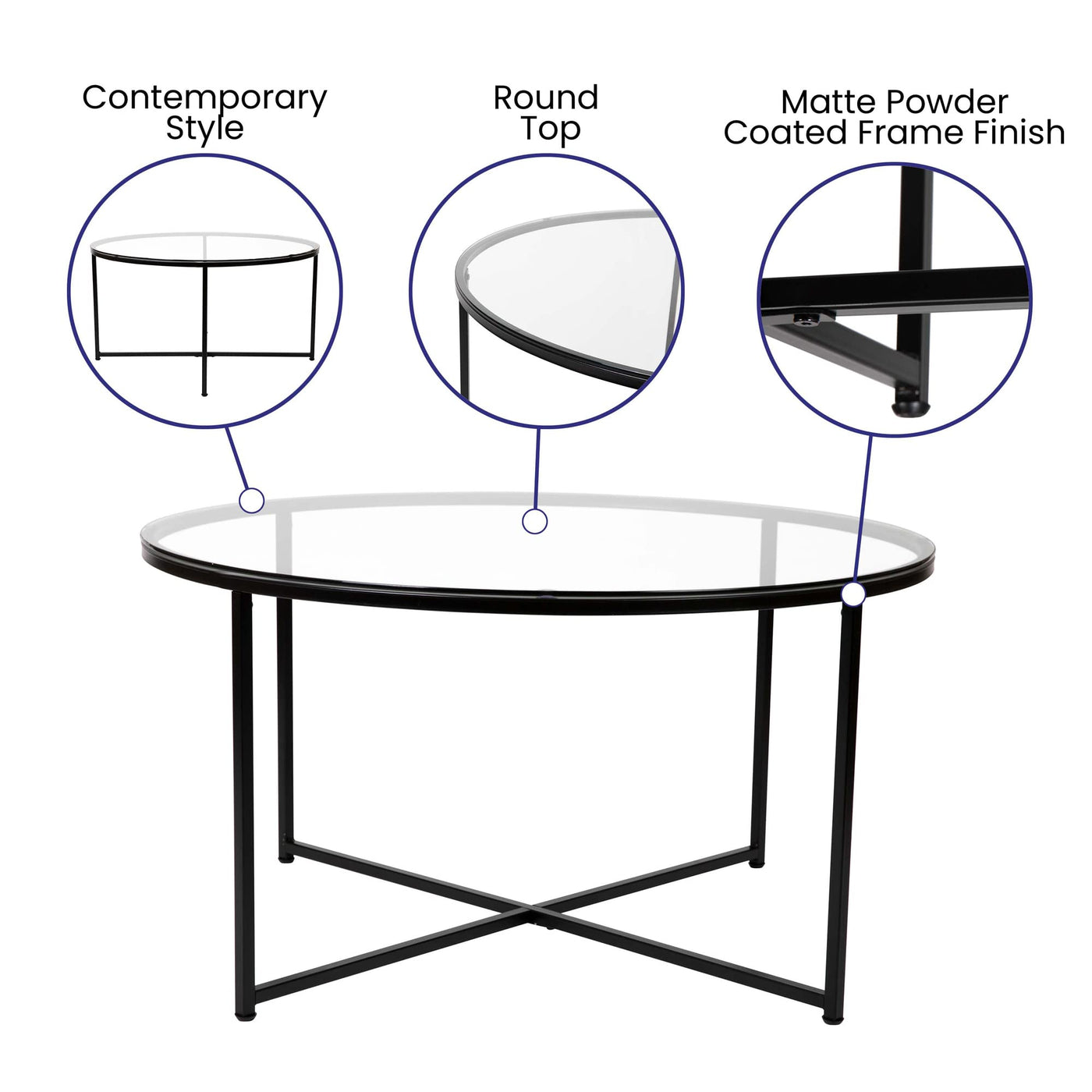 Add an upscale look to any room in your living space with the effortless style of this coffee table. Featuring a crystal clear glass top, this occasional table set lends an open, airy feel to any space. The round shape atop modern crisscross matte black metal legs completes the overall look of this stunning piece. Whether you're serving coffee, tea, or just want a place for decorative items, you will never have to worry about the safety of this table. Strong, 6mm tempered glass resists breakage even with daily use while the sturdy cross brace metal frame keeps your possessions secure. A durable powder coated finish ensures this living room table will look great for years to come. Have your new table ready to use in under 30 minutes with the included step-by-step instructions and included tools. Floor glides will protect your hard flooring surfaces from scuffs and scrape and messes clean up quickly and easily with a water based cleaner.