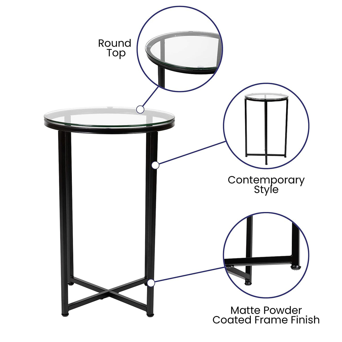 Add an upscale look to any room in your living space with the effortless style of this end table. Featuring a crystal clear glass top, this occasional table set lends an open, airy feel to any space. The round shape atop modern crisscross matte black metal legs completes the overall look of this stunning piece. Whether you're serving end, tea, or just want a place for decorative items, you will never have to worry about the safety of this table. Strong, 6mm tempered glass resists breakage even with daily use while the sturdy cross brace metal frame keeps your possessions secure. A durable powder coated finish ensures this living room table will look great for years to come. Have your new table ready to use in under 30 minutes with the included step-by-step instructions and included tools. Floor glides will protect your hard flooring surfaces from scuffs and scrape and messes clean up quickly and easily with a water based cleaner.