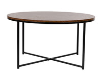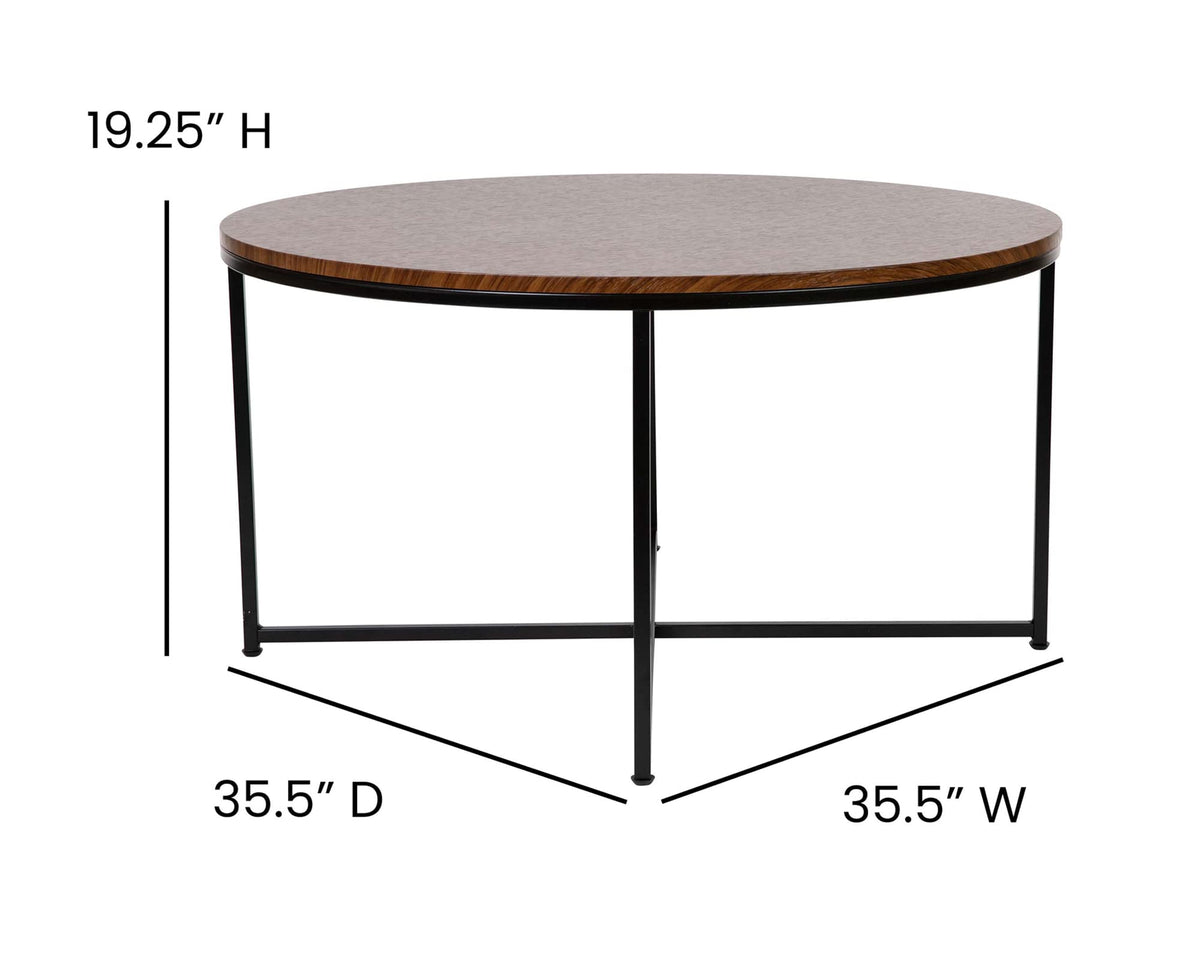 Update the atmosphere in your home with the sophisticated, polished look of this mixed media coffee table. Featuring a walnut finished laminate top, this occasional table blends seamlessly in any space. The round shape atop modern crisscross matte black metal legs completes the overall look of this stunning piece. Whether you're serving coffee, tea, or just want a place for decorative items, you will never have to worry about the safety of this table. The strong .5 inch thick engineered wood top stands up to daily use while the sturdy cross brace metal frame holds up to 55 lbs. static weight capacity. A durable powder coated finish ensures this living room table will look great for years to come. Have your new coffee table ready to use in under 30 minutes with the included step-by-step instructions and included tools. Floor glides will protect your hard flooring surfaces from scuffs and scrape and messes clean up quickly and easily with a water based cleaner.
