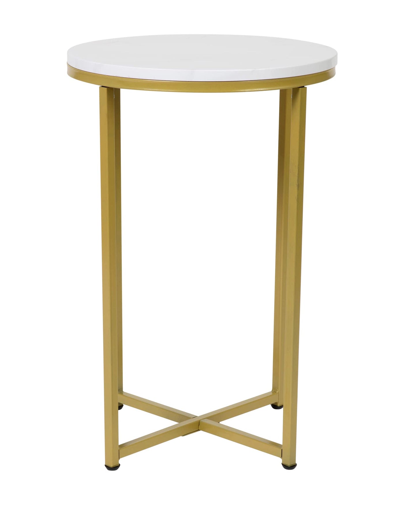 Update the atmosphere in your home with the sophisticated, polished look of this mixed media end table. Featuring a marbled white finished laminate top, this occasional table blends seamlessly in any space. The round shape atop modern crisscross brushed gold metal legs completes the overall look of this stunning piece. Whether you're serving coffee, tea, or just want a place for decorative items, you will never have to worry about the safety of this table. The strong .5 inch thick engineered wood top stands up to daily use while the sturdy cross brace metal frame holds up to 55 lbs. static weight capacity. A durable powder coated finish ensures this living room table will look great for years to come. Have your new end table ready to use in under 30 minutes with the included step-by-step instructions and included tools. Floor glides will protect your hard flooring surfaces from scuffs and scrape and messes clean up quickly and easily with a water based cleaner.