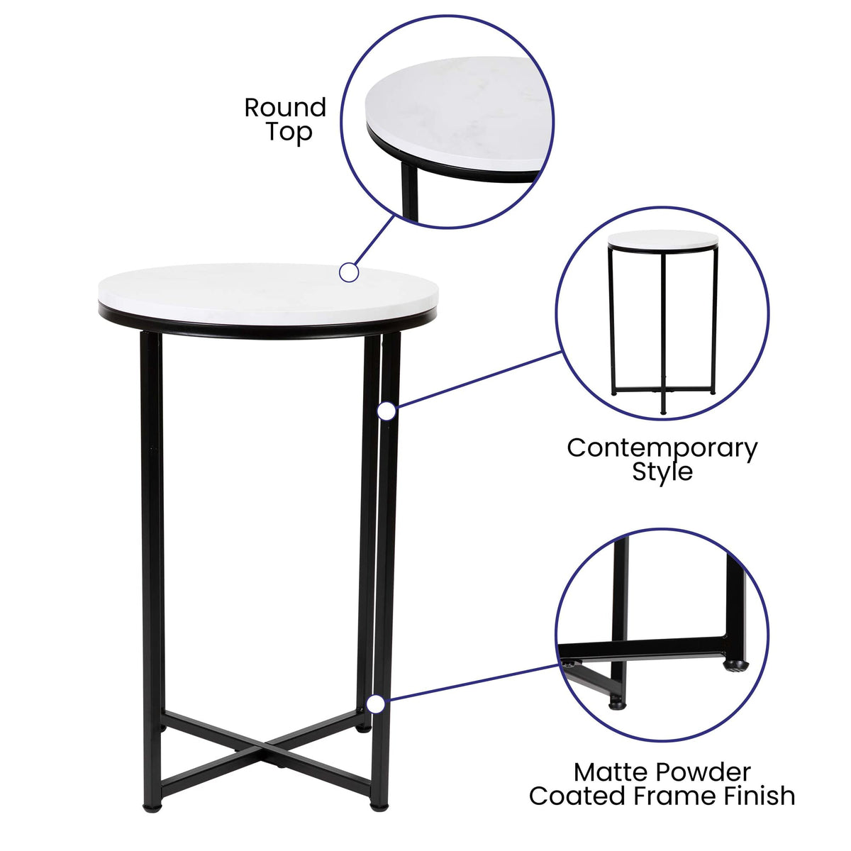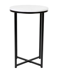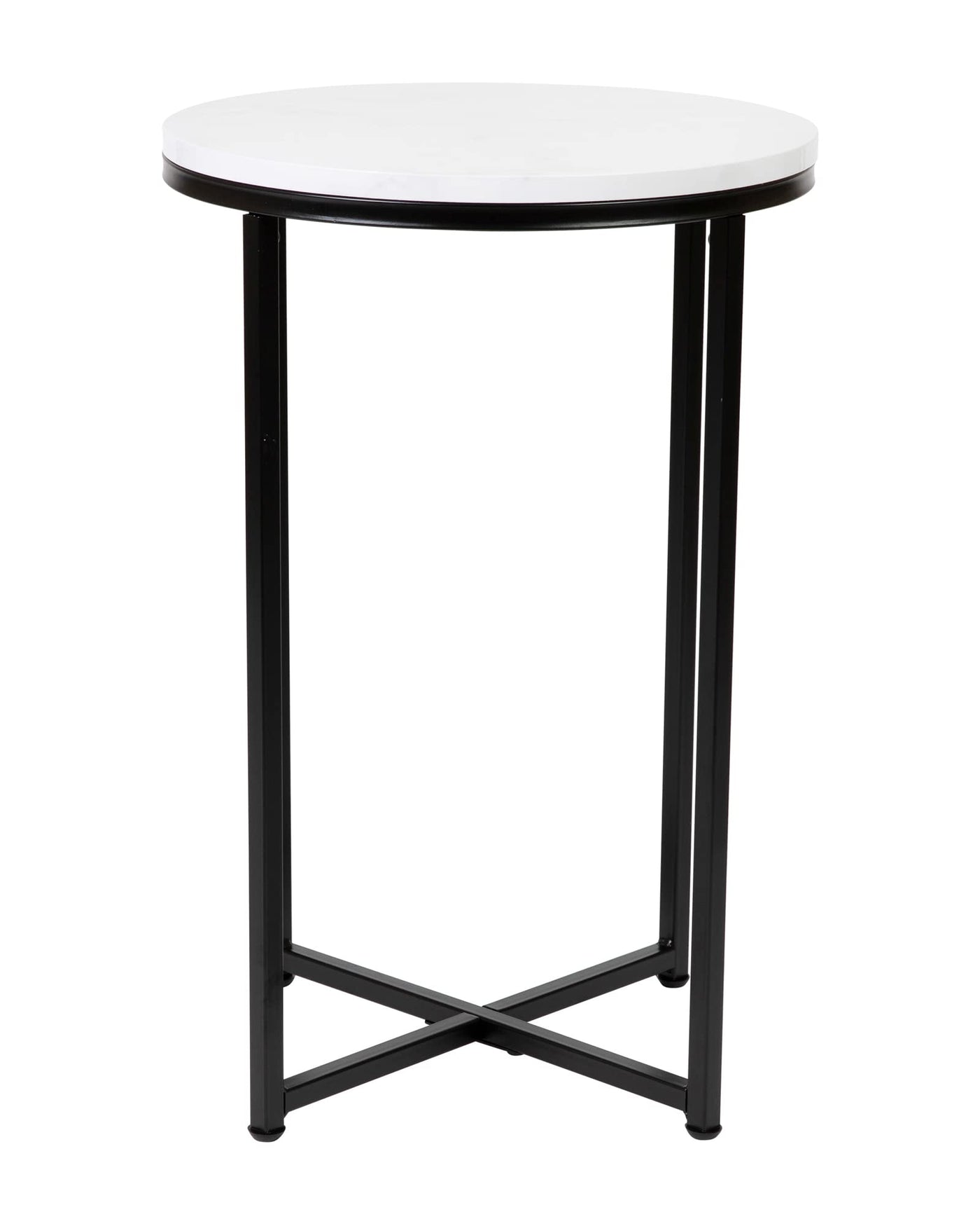 Update the atmosphere in your home with the sophisticated, polished look of this mixed media end table. Featuring a marbled white finished laminate top, this occasional table blends seamlessly in any space. The round shape atop modern crisscross matte black metal legs completes the overall look of this stunning piece. Whether you're serving coffee, tea, or just want a place for decorative items, you will never have to worry about the safety of this table. The strong .5 inch thick engineered wood top stands up to daily use while the sturdy cross brace metal frame holds up to 55 lbs. static weight capacity. A durable powder coated finish ensures this living room table will look great for years to come. Have your new end table ready to use in under 30 minutes with the included step-by-step instructions and included tools. Floor glides will protect your hard flooring surfaces from scuffs and scrape and messes clean up quickly and easily with a water based cleaner.