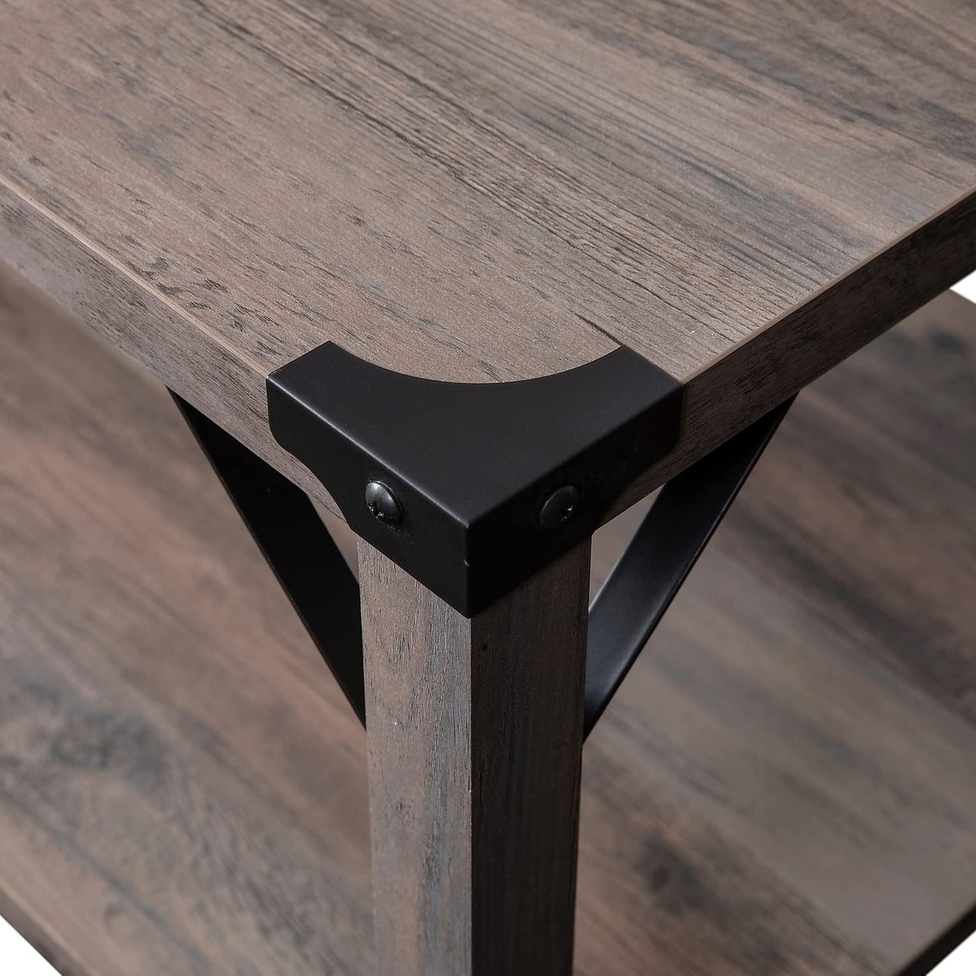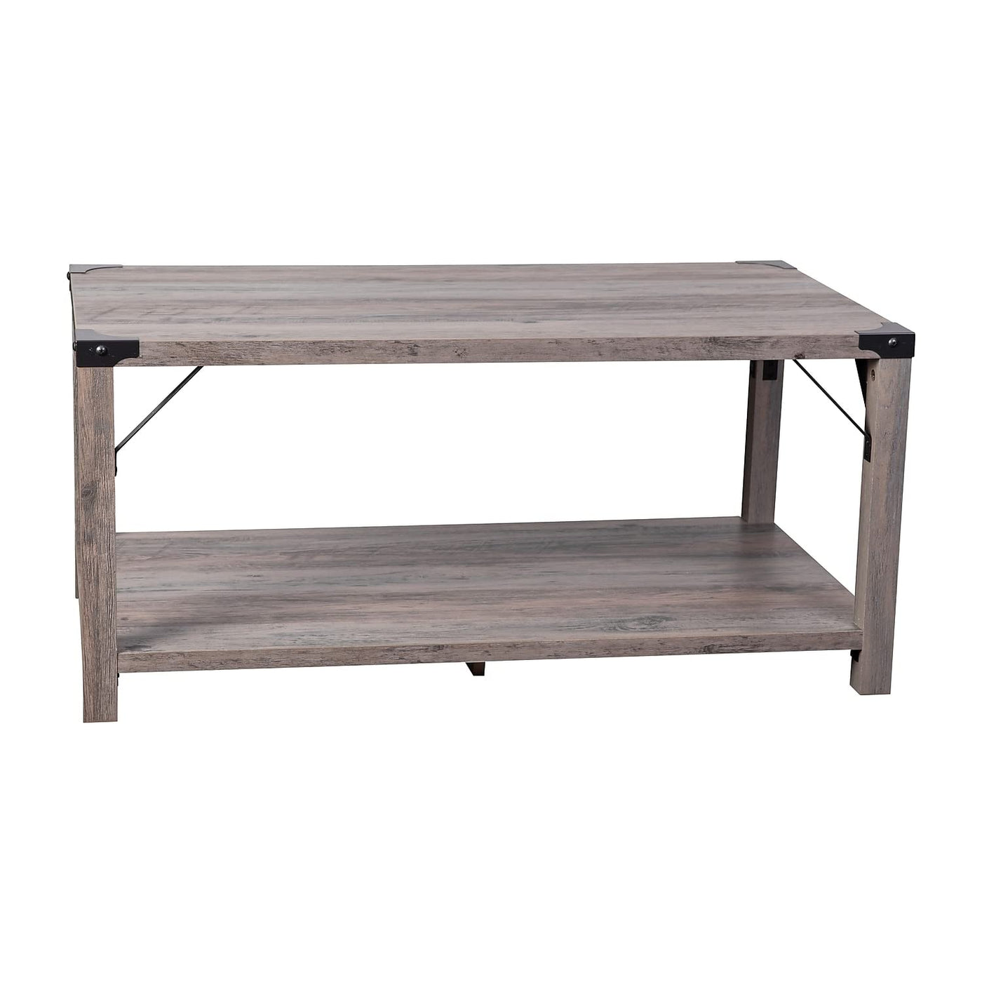 Plan a cozy gathering in your home with this trendy 2-tier farmhouse style coffee table ideal for your living space. The warp resistant engineered wood frame with powder coated diagonal metal side bracing gives you long-lasting performance while the metal corner accents give a pop of sophistication that will always be welcome in any aesthetic. Place drinks, snacks, or decor on the upper tier that holds up to 125 lbs. static weight and keep throw blankets handy for movie night on the lower tier of open storage that holds up to 50 lbs. static weight. Fixed floor glides prevent damage to your indoor flooring surfaces and a damp cloth is all that is required to maintain the appearance of your new table that assembles in 60 minutes or less. Pair with our matching console or side tables for a cohesive theme throughout your home.