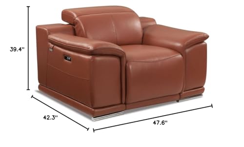 Relaxation has never been more enjoyable and chic with our Mod Camel Brown Italian Leather Recliner Chair. The chairs design has elegance written all over it and its modern style is exactly what you need to showcase unmatched luxury. When you combine its magnificent cushioning with extra padded arms on both flanks of the chair, you have enough room to enjoy comfort at its best. With chrome legs, a generous headrest, seat cushions, and topnotch Italian leather upholstery, this chair has a motorized recline that effortlessly combines luxury with comfort and style. A quality masterpiece indeed this is certainly not your fathers recliner. Features. Features Tone on Tone Stitching. High Quality and Sturdy Construction of Solid Brazilian Wood and Fine Italian LeatherSpecifications. Color Camel. Style Modern. Commercial / Residential Residential Use. Upholstery Material Italian Leather. Seat Fill Material Foam. Back Fill Material Foam. Frame Material Solid, Manufactured Wood. Arm Type Square Arms. Leg Color Chrome. Leg Material Metal. Seat Height Floor to Seat 18.9 in.. Seat Width Side to Side 22.4 in.. Seat Depth Front to Back 22.6 in.. Arm Height Floor to Arm 23.6 in.. Material Italian Leather. Dimension 39.4 x 47.6 x 42.3 in.. Weight 223 lbs