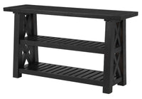 The Bolton Sofa Table offers an Industrial Rustic style to your living or family room. The table is constructed of solid New Zealand Pine and finished in a Black Stain. The industrial style is represented with four large dark aged brass finished industrial bolts that span across each end the top. The x-framed legs not only add to the look, but provide extra stability. The 1.5” thick tops are detailed with a plank design purposeful distress marked details. Two shelves allow for plenty of storage space. The 55” wide design allows for the table to also be used as a TV Stand or Console for TVs up to 60” W. Assembled product dimensions: 55" W x 16" D x 30" H. Product materials: New Zealand Pine. Easy to assemble. Made in Vietnam.
