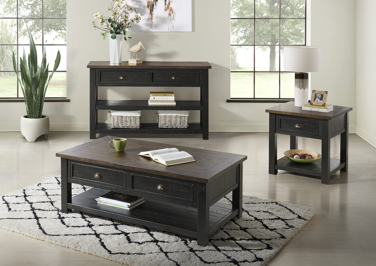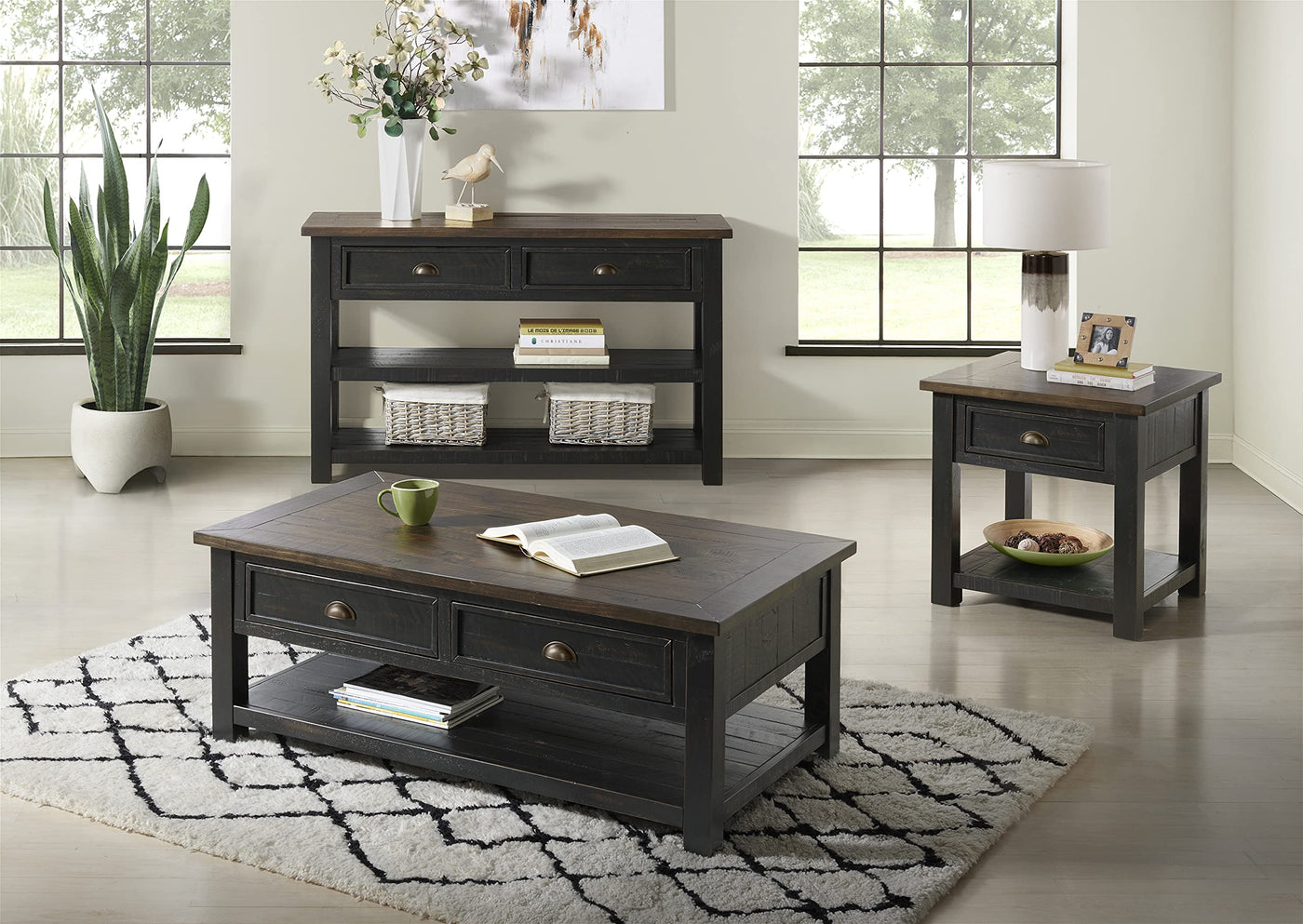 The Monterey Coffee Table combines the Coastal and Farmhouse styles in to fashionable and functional table. Constructed from solid Pine and finished in a Black base and Brown Top. Two (2) well sized drawers allow for plenty of storage space for TV controllers, magazines, puzzles, board games and other items. Each drawer is designed to be pulled through in order to access from either side. Antique pewter finished hardware, miter cuts on the top, framed drawers adds an extra element of detail to the collection. Hidden caster wheels are included allowing you to move the table to different positions which is perfect for a motion sofa or chair. Assembled product dimensions: 50" W x 28" D x 19" H. Product materials: Solid wood - New Zealand Pine. Easy assembly required. Made in Vietnam.