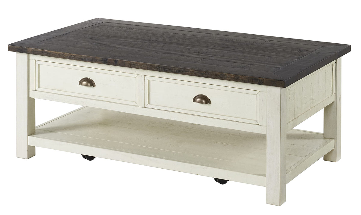 Introducing our Coastal Coffee Table, a stunning blend of seaside charm and timeless elegance. Crafted from Solid Wood, this table features a Cream White finish with a contrasting Brown top, adding a touch of coastal sophistication to your living space. The rectangular shape and framed design give this table a classic look, while the Wormwood Details add a rustic touch. The pull-through drawers offer convenient storage for your essentials, keeping your space organized and clutter-free. Finished with Antique Pewter hardware, this coffee table is both stylish and functional. Martin Svensson Home is an American company started by the man himself, Martin Svensson, a Swedish immigrant over 100 years ago. We continue his legacy today by delivering high quality, affordable solid wood luxury furniture. Your satisfaction is our guarantee. When you pick up a Martin Svensson piece, you can rest assure that this furniture will last a lifetime!