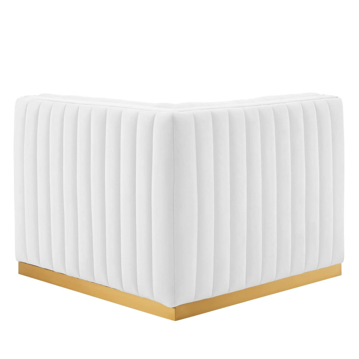 Modern appeal surrounds the Conjure Channel Tufted Performance Velvet Upholstered Right Corner Chair. Luxuriously soft, stain-resistant performance velvet upholstery covers dense foam padding and an individually wrapped spring coil system for a supportive living room chair that will become the go-to lounge spot for family and friends. Vertical channel tufting and subtle French piping adds depth to this vintage inspired sectional piece that effortlessly becomes the focal point in your living room. Solidly constructed from wood and plywood, this corner chair features non-marking foot caps and boasts a brushed gold stainless steel base. Versatile and elegant, this sectional sofa piece is ideally suited for a variety of decor styles in your living room, lounge, or home office. Chair Weight Capacity: 331 lbs.Features:Materials: Performance velvet, metal, stain resistant fabricFinish: Gold, whiteFrench piping accentsGlam deco styleSpecifications:Product Dimensions: 28"H x 36.5"W x 36.5"DProduct Weight: 53 lbsChair Weight Capacity: 331 lbs