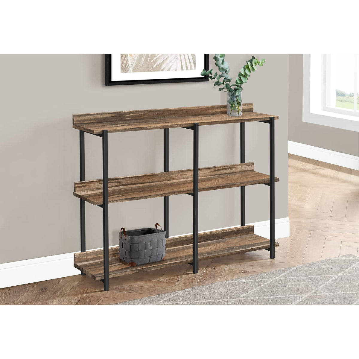 This 3-tier console table steps up when you need a stylish way to proudly display prized possessions. The 2 bottom shelves provide a symmetrical way to arrange decorative items. Above the shelves is a long, narrow tabletop that offers space for placing a small table lamp and a plant, or to rest your keys and mobile devices when you arrive home. Supporting the tabletop and shelf panels finished in brown reclaimed wood-look is a metal base in a contrasting black finish. The sturdy metal frame features bold angles and clean lines for a modern look. With a compact profile and ample display space, this versatile accent table with 3 storage shelves is a great choice for a hallway, an entryway, or behind a sofa in a living room. Additional dimensions: Space between underside of tabletop and top of center shelf: 13.5 inches. Space between center shelf and bottom shelf: 14.5 inches.