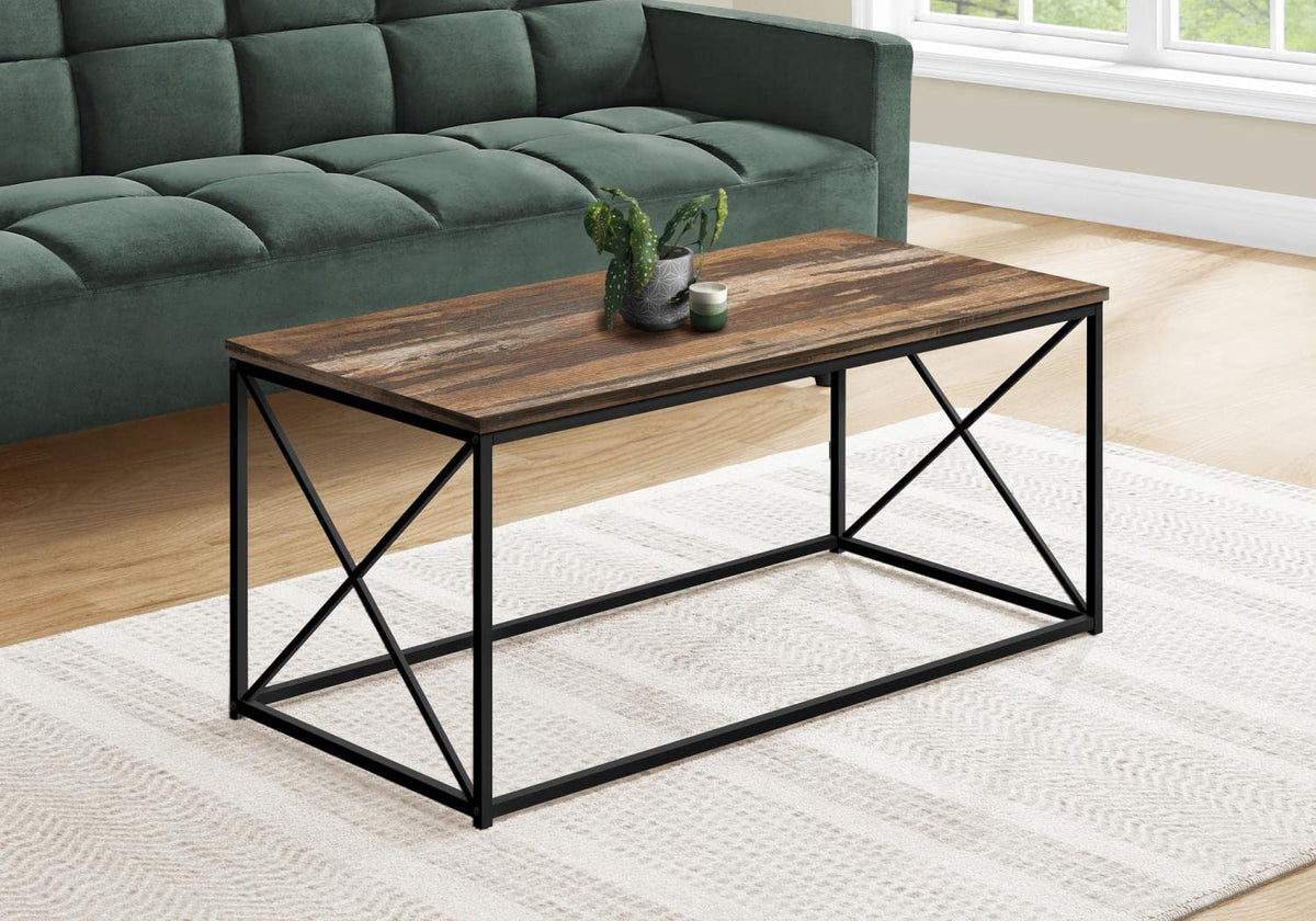 From homes, condos and apartments, this contemporary coffee table fits perfectly in your living room, basement, family room or bedroom. Supported by black metal X shaped base, this table combines both style and practicality perfectly. The center table will accommodate anything from plants, electronics, photo frames to books and other decor items. With an on-trend modern medium brown reclaimed wood-look finish, it will warm up your living space effortlessly.