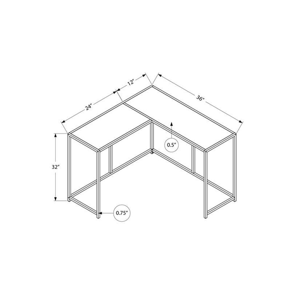 Look at displaying objects from a different angle with this corner console table featuring an innovative design. While corner tables typically have a triangular shape and most console tables are rectangular, this accent table has a unique L-shaped design. Its slim, right-angle shape takes up less room and maximizes the horizontal space available in a corner, unlike tall etageres that optimize vertical space. Finished in a grey wood-look laminate, the L-shaped tabletop offers plenty of space for picture frames, a table lamp, and more. Outlining and providing support for the desktop panels is a slender metal frame in a contrasting black finish with an open, airy design. Place this space-saving console table in the corner of a living room, bedroom, or any room in need of additional display surfaces.